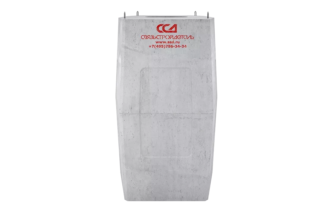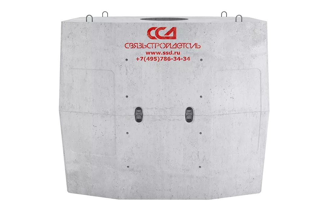 Колодец имеет в сечении восьмиугольную форму и состоит из двух элементов – верхней и нижней половин. Перекрытие верхнего элемента дополнительно армировано и содержит круглое отверстие диаметром 600 мм для формирования горловины с люков. В основании корпуса колодца с внутренней стороны расположена прямоугольная ниша. При необходимости, ее стенку вырезают для создания дренажа. На наружных поверхностях торцевых и боковых стен расположены глухие ниши, в пределах которых монтируются муфты ССД-Пайп (количество и диаметр труб определяется согласно опросному листу). На торцевых поверхностях корпуса колодца имеются петли для строповки при его погрузке и разгрузке с автомобиля, а также для опускания в котлован.