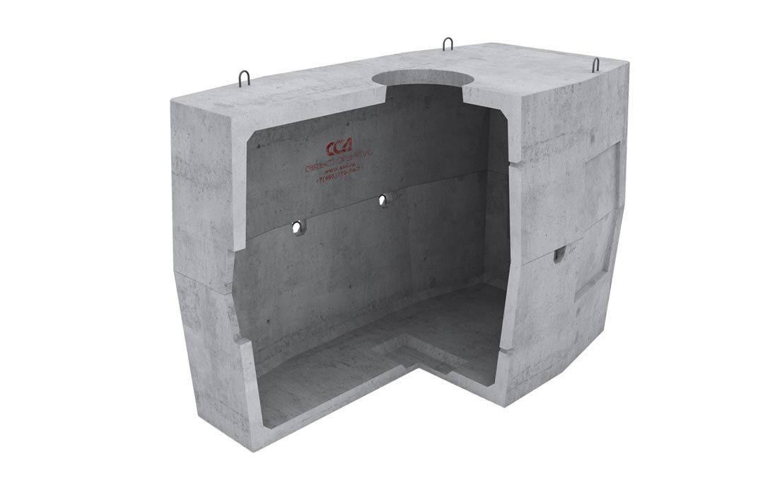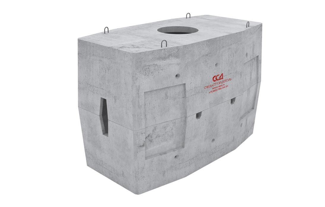 Колодец имеет в сечении восьмиугольную форму и состоит из двух элементов – верхней и нижней половин. Перекрытие верхнего элемента дополнительно армировано и содержит круглое отверстие диаметром 600 мм для формирования горловины с люков. В основании корпуса колодца с внутренней стороны расположена прямоугольная ниша. При необходимости, ее стенку вырезают для создания дренажа. На наружных поверхностях торцевых и боковых стен расположены глухие ниши, в пределах которых монтируются муфты ССД-Пайп (количество и диаметр труб определяется согласно опросному листу). На торцевых поверхностях корпуса колодца имеются петли для строповки при его погрузке и разгрузке с автомобиля, а также для опускания в котлован.