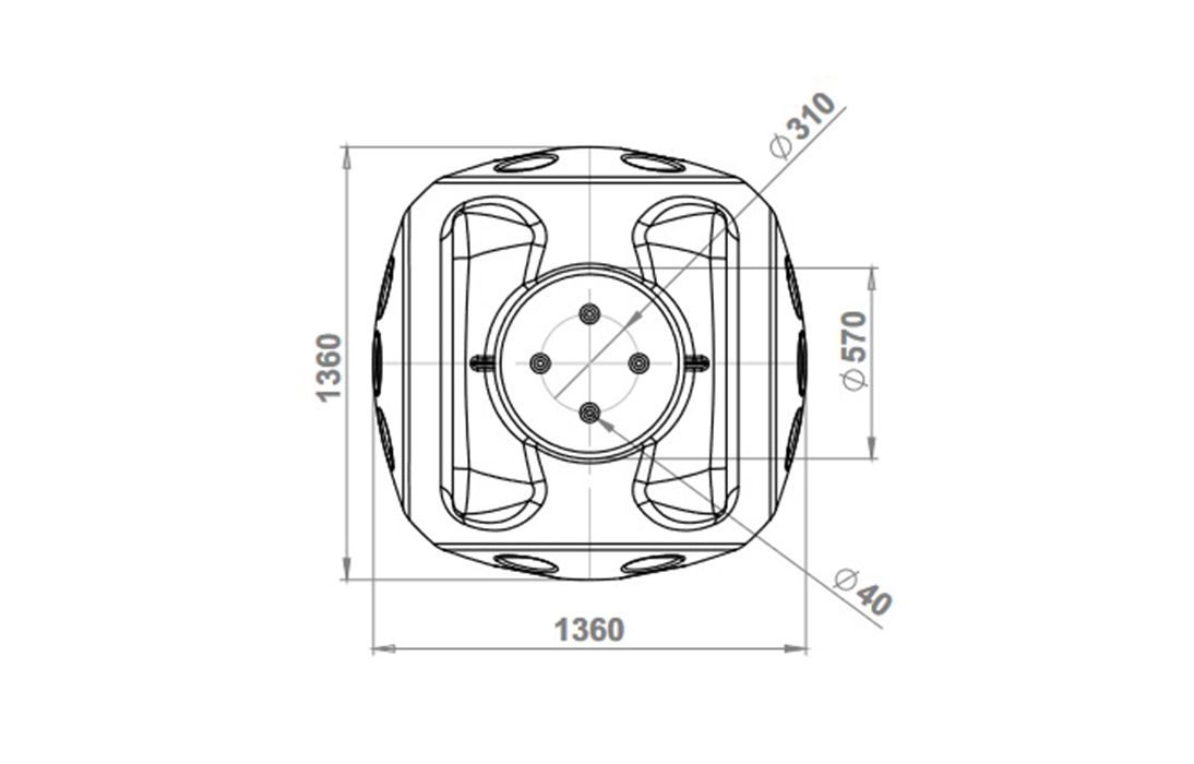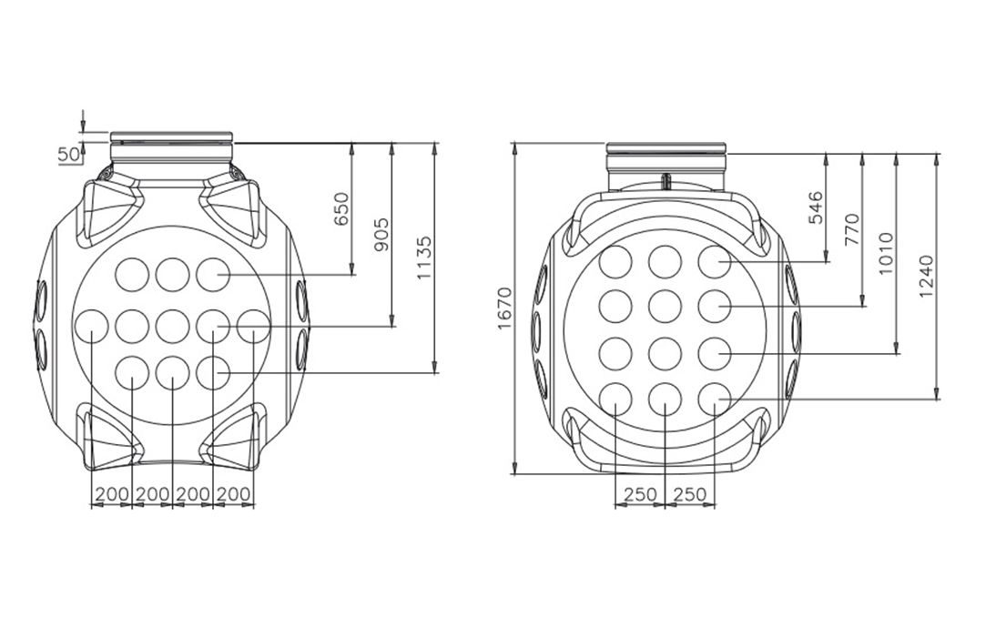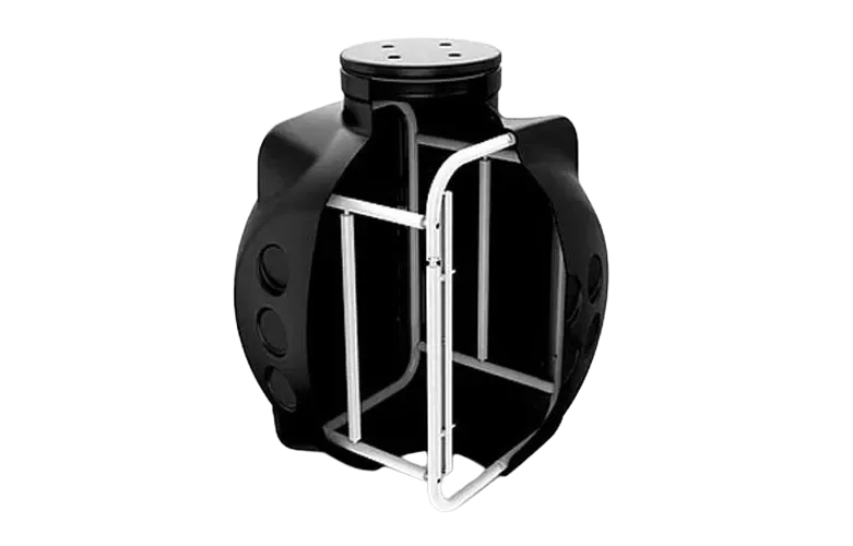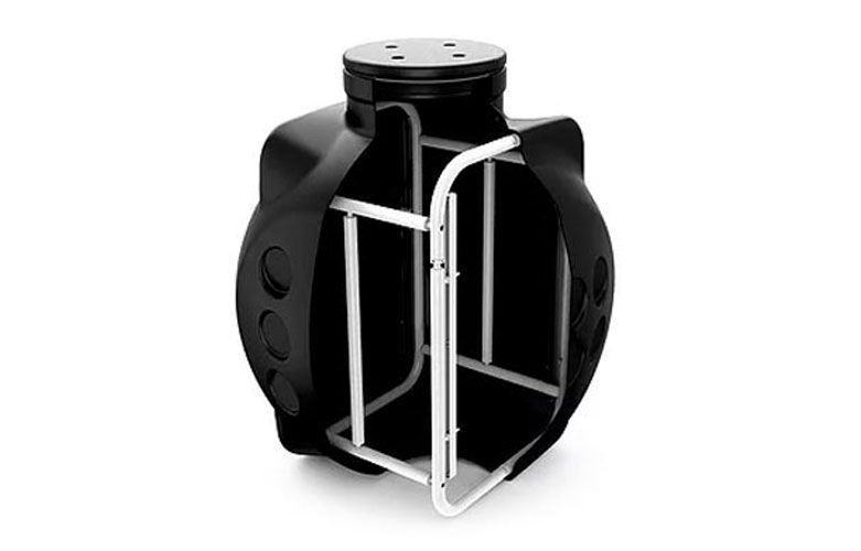 Представляет собой цельнолитое изделие шарообразной формы, без сварных швов, обеспечивающих его герметичность. Корпус колодца имеет ребра жесткости для придания ему повышенной прочности. С четырех сторон, на стенках колодца имеются специально сформированные контуры для ввода гладкостенных, гофрированных или спиральных труб. Каждая стенка содержит по 6-ть таких контуров диаметром 170 мм.