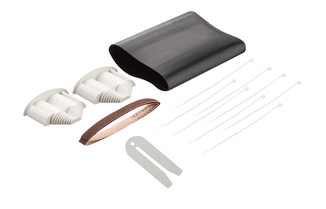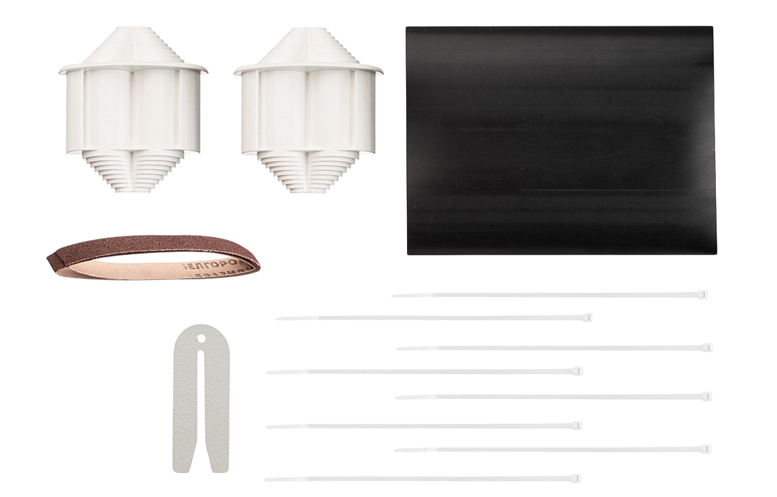 В состав комплекта №6 входят зажим, изготовленный из высококачественной стали, а также пластиковый наконечник из двух половин, которые после усадки трубки ТУТ обеспечивают надежную фиксацию кабеля и защиту от влаги.