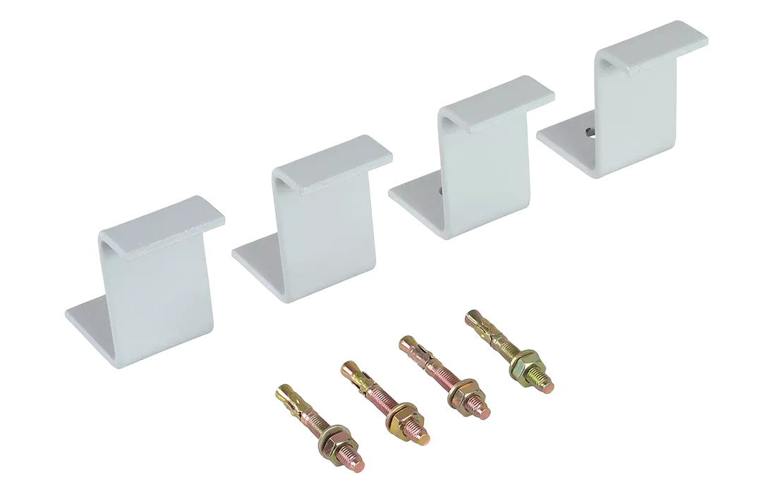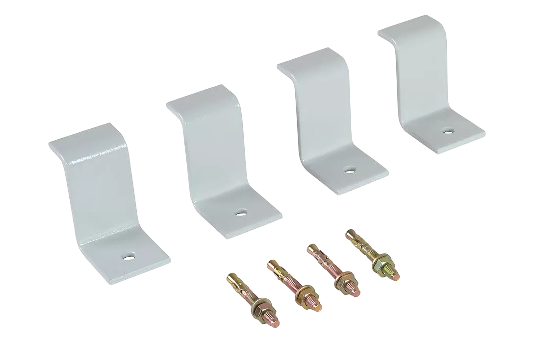 Комплект состоит из 4 металлических скоб с отверстиями, специальным образом изогнутых по форме дна камеры, а также 4 клиновых анкеров для фиксации КОТ-3 к основанию. Скобы покрыты порошковой краской.