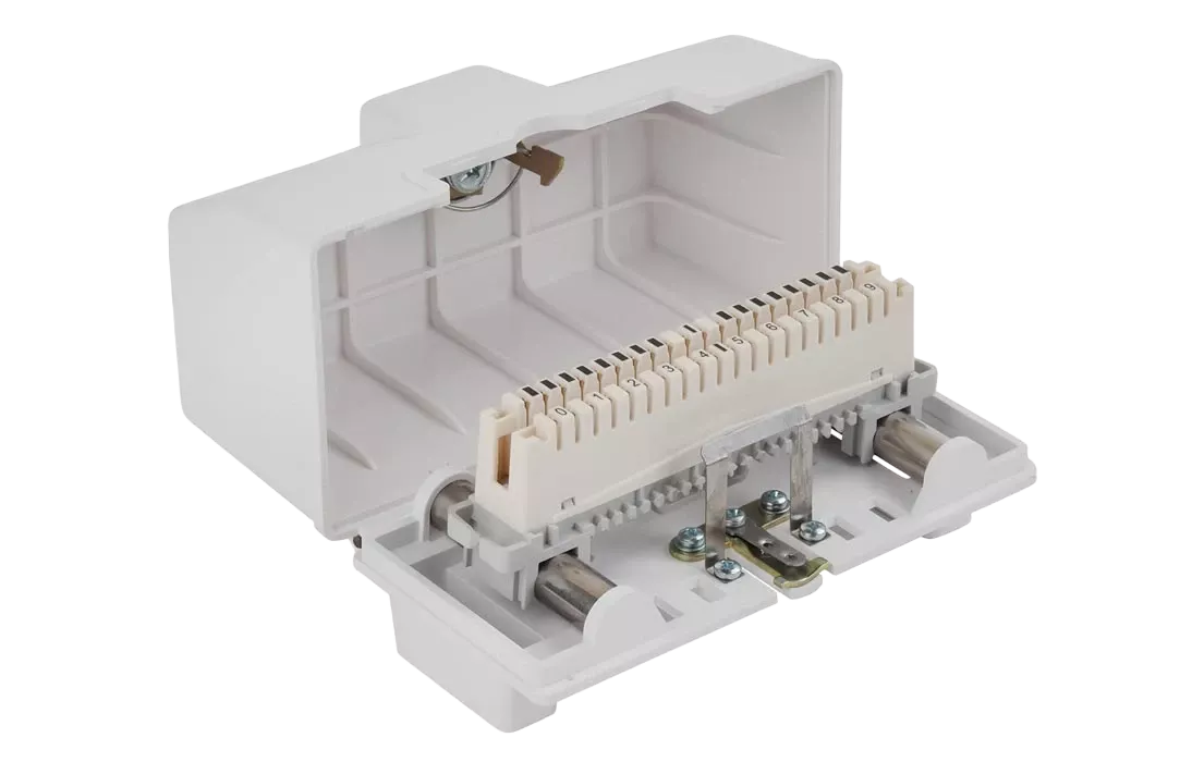 Конструкция узла крепления кабелей в коробках при необходимости обеспечивает надежный электрический контакт с экраном входящего распределительного кабеля, что облегчает его заземление. Ввод кабелей осуществляется через вырез в крышке, что упрощает монтаж и позволяет использовать для абонентской разводки не только провода ТРП/ТРВ, но и четырехпарные кабели типа UTP/FTP.