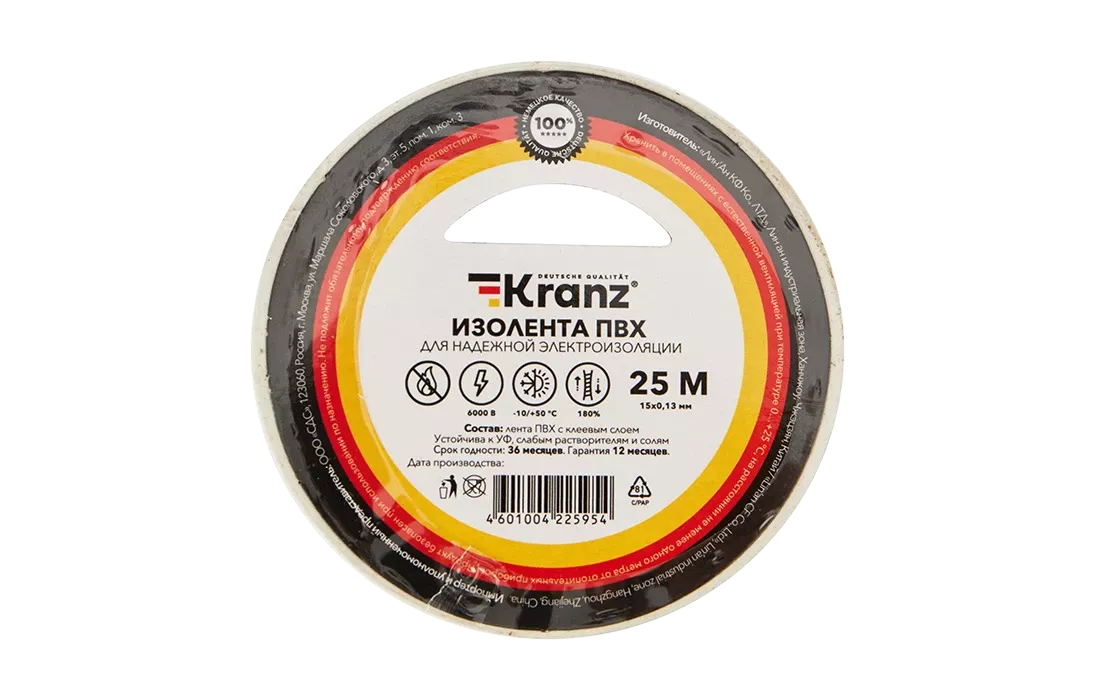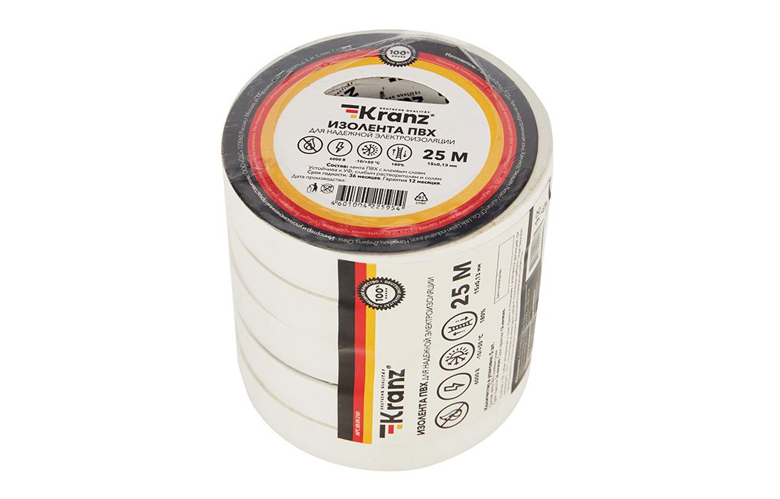 Изолента KRANZ предназначена для электрической изоляции, цветной маркировки, соединения, защиты от внешних факторов и герметизации кабелей, проводов и шнуров.
