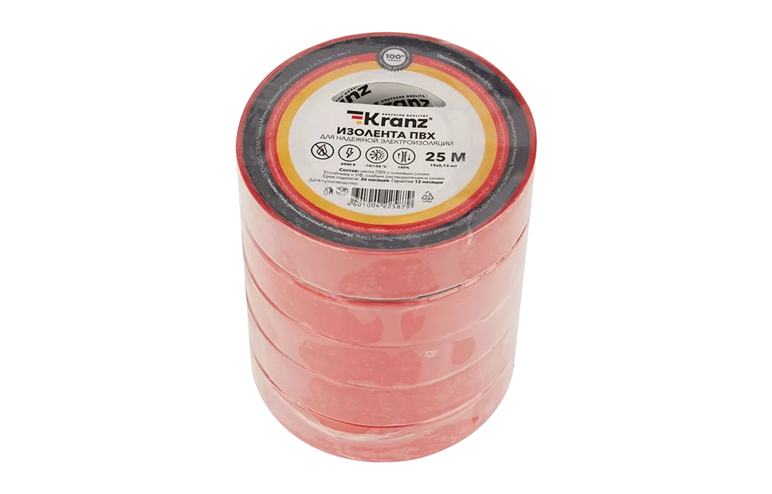 KR-09-2204 Изолента ПВХ KRANZ 19 мм х 25 м, красная, упаковка 5 роликов