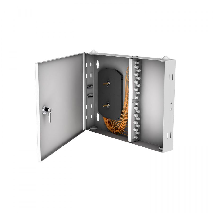 Кросс оптический настенный NTSS PREMIUM предназначен для оконцовки оптического кабеля и коммутации с внешними устройствами через оптические адаптеры. Кросс оптический NTSS-WFOB PREMIUM предсобранный предназначен для монтажа на стену. Настенные оптические кроссы под планки изготавливаются трёх размеров, до 16 портов - под 2 планки по 8 портов, до 48 портов - под 2 планки по 24 порта или 4 планки по 8 портов, до 96 портов - под 12 планок по 8 портов. Изделие имеет жесткий металлический корпус, покрытый порошковой окраской. Оптические компоненты предустановлены при производстве. Для ввода кабеля имеются отверстия сверху и снизу кросса, с торца кросса расположены отверстия для крепления вводимого кабеля и центрального силового элемента. Для монтажа сплайс кассет в кроссе есть несъемные шпильки с гайками-барашками. Настенные кроссы могут закрываться на ключ. Кроссы выпускаются в сером и черном цвете. Под заказ возможно изготовление кроссов любого цвета.
