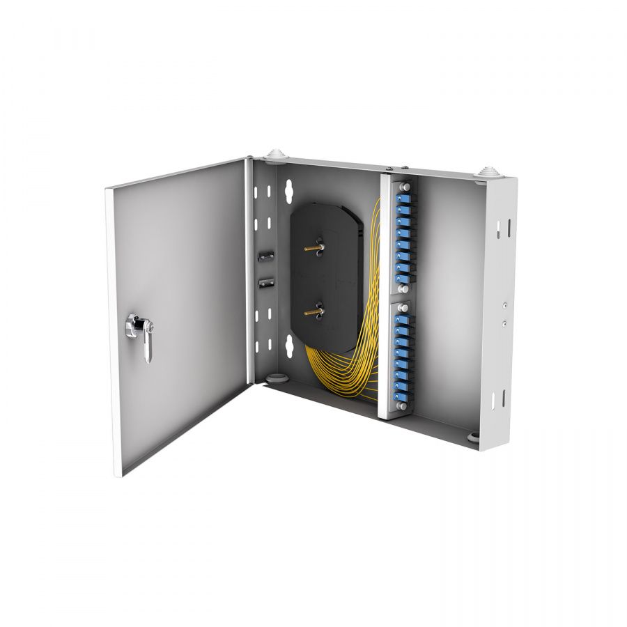 Кросс оптический настенный NTSS PREMIUM предназначен для оконцовки оптического кабеля и коммутации с внешними устройствами через оптические адаптеры. Кросс оптический NTSS-WFOB PREMIUM предсобранный предназначен для монтажа на стену. Настенные оптические кроссы под планки изготавливаются трёх размеров, до 16 портов - под 2 планки по 8 портов, до 48 портов - под 2 планки по 24 порта или 4 планки по 8 портов, до 96 портов - под 12 планок по 8 портов. Изделие имеет жесткий металлический корпус, покрытый порошковой окраской. Оптические компоненты предустановлены при производстве. Для ввода кабеля имеются отверстия сверху и снизу кросса, с торца кросса расположены отверстия для крепления вводимого кабеля и центрального силового элемента. Для монтажа сплайс кассет в кроссе есть несъемные шпильки с гайками-барашками. Настенные кроссы могут закрываться на ключ. Кроссы выпускаются в сером и черном цвете. Под заказ возможно изготовление кроссов любого цвета.