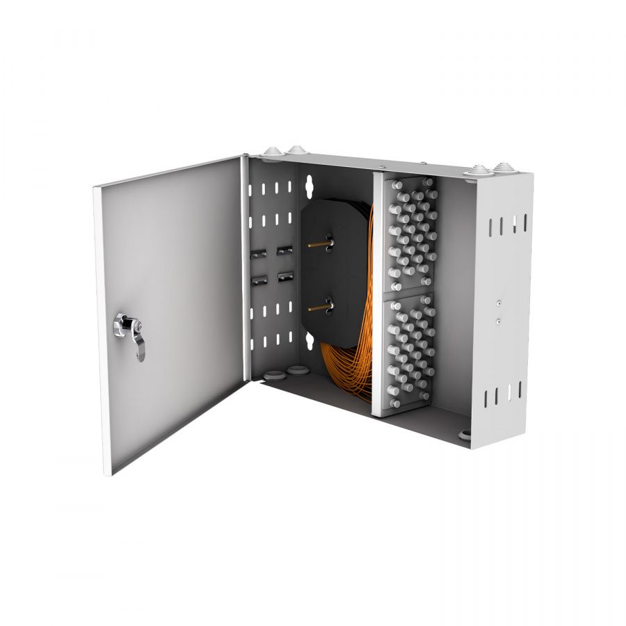 Кросс оптический настенный NTSS PREMIUM предназначен для оконцовки оптического кабеля и коммутации с внешними устройствами через оптические адаптеры. Кросс оптический NTSS-WFOB PREMIUM предсобранный предназначен для монтажа на стену. Настенные оптические кроссы под планки изготавливаются трёх размеров, до 16 портов - под 2 планки по 8 портов, до 48 портов - под 2 планки по 24 порта или 4 планки по 8 портов, до 96 портов - под 12 планок по 8 портов. Изделие имеет жесткий металлический корпус, покрытый порошковой окраской. Оптические компоненты предустановлены при производстве. Для ввода кабеля имеются отверстия сверху и снизу кросса, с торца кросса расположены отверстия для крепления вводимого кабеля и центрального силового элемента. Для монтажа сплайс кассет в кроссе есть несъемные шпильки с гайками-барашками. Настенные кроссы могут закрываться на ключ. Кроссы выпускаются в сером и черном цвете. Под заказ возможно изготовление кроссов любого цвета.