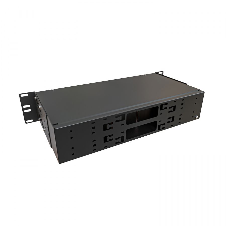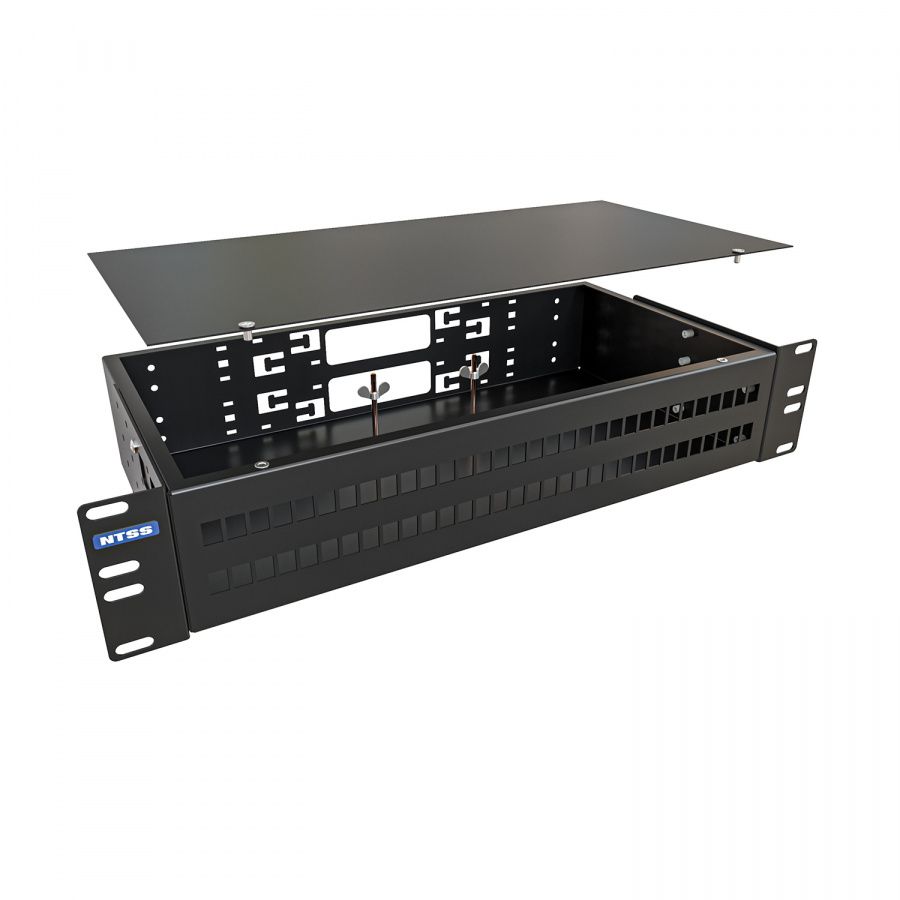 Кросс NTSS оптический 19'' укомплектованный 2U, 64 порта LC/UPC duplex, 50/125 мкм ОМ4 (сплошная панель, сплайс-кассета 4шт, пигтейлы, КДЗС, адаптеры) черный RAL 9005