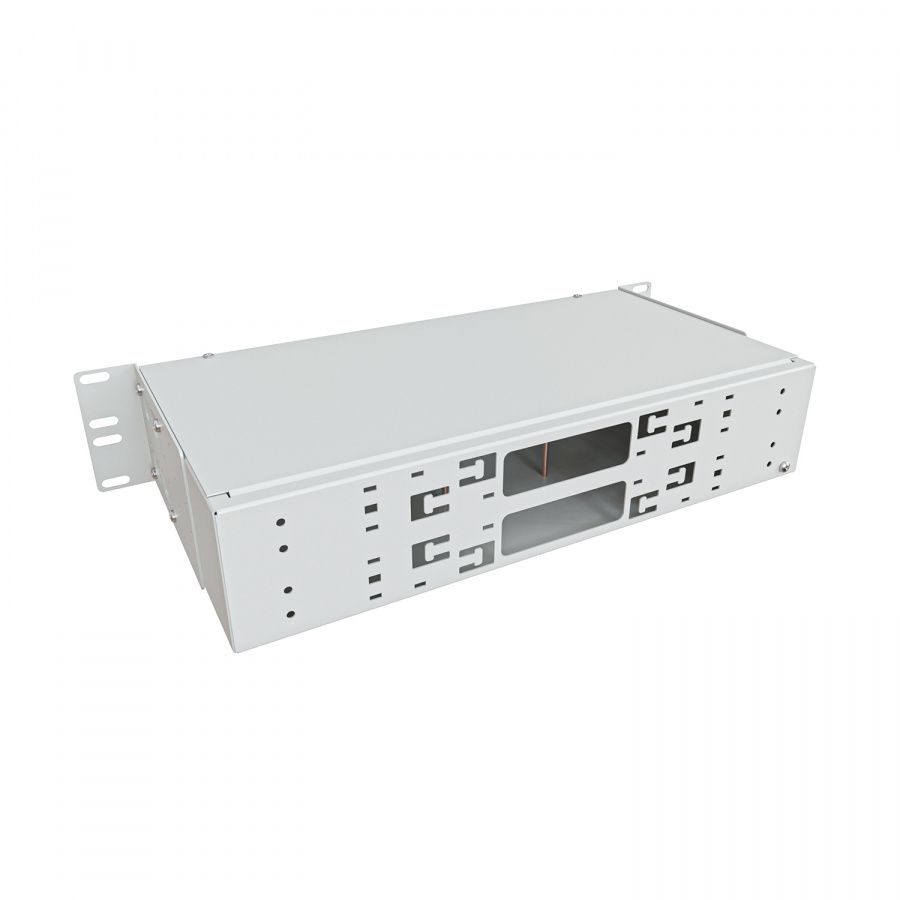 Кросс NTSS оптический 19'' укомплектованный 2U, 64 порта LC/UPC duplex, 9/125 мкм (сплошная панель, сплайс-кассета 4шт, пигтейлы, КДЗС, адаптеры) серый RAL 7035