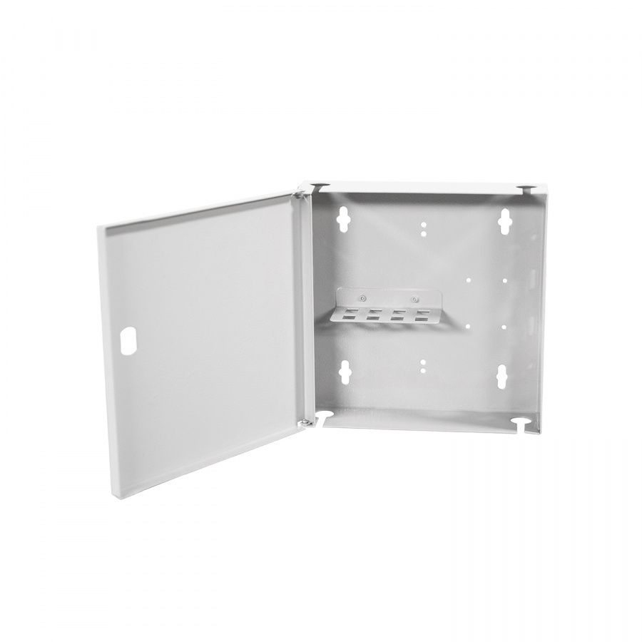 Кросс оптический настенный Мини NTSS-WFOBMн укомплектованный с фиксированной адаптерной планкой предназначен для установки на любую плоскую поверхность и подключения волоконного оптического кабеля и оптических шнуров в волоконно-оптических линиях связи. Изделие имеет жесткий металлический корпус, покрытый порошковой окраской. В боковых панелях корпуса кросса выполнены отверстия для ввода и вывода кабелей или коммутационных шнуров. Внутри корпуса жестко установлена адаптерная планка под оптические адаптеры, в соответствии с артикульным номером кросса. Конструкция кросса обеспечивает защиту соединений подключаемых к адаптерам монтажных шнуров от механических повреждений или несанкционированной коммутации. Корпус кросса закрывается дверцей, запираемой на замок. Внутри изделия предусмотрен ложемент, для фиксации термоусаживаемых гильз КДЗС, защищающих места сварки оптических волокон. В корпусе кросса предусмотрены места крепления внешней оболочки оптического кабеля, упрочняющих волокон, силового элемента вводимого кабеля. Кроссы выпускаются в сером и черном цвете. Под заказ возможно изготовление кроссов любого цвета.