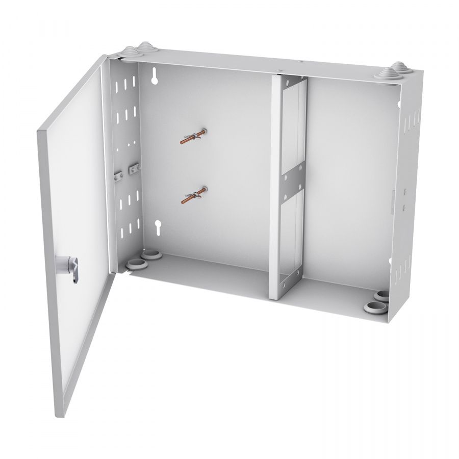 Кросс оптический настенный предназначен для оконцовки оптического кабеля и коммутации с внешними устройствами через оптические адаптеры. Кросс оптический NTSS-WFOB предназначен для монтажа на стену. Настенные оптические кроссы под планки изготавливаются трёх размеров, до 16 портов - под 2 планки по 8 портов, до 48 портов - под 2 планки по 24 порта или 4 планки по 8 портов, до 96 портов - под 12 планок по 8 портов. Для ввода кабеля имеются отверстия сверху и снизу кросса, с торца кросса расположены отверстия для крепления вводимого кабеля и центрального силового элемента. Для монтажа сплайс кассет в кроссе есть несъемные шпильки с гайками-барашками. Настенные кроссы могут закрываться на ключ. Кроссы выпускаются в сером и черном цвете. Под заказ возможно изготовление кроссов любого цвета.