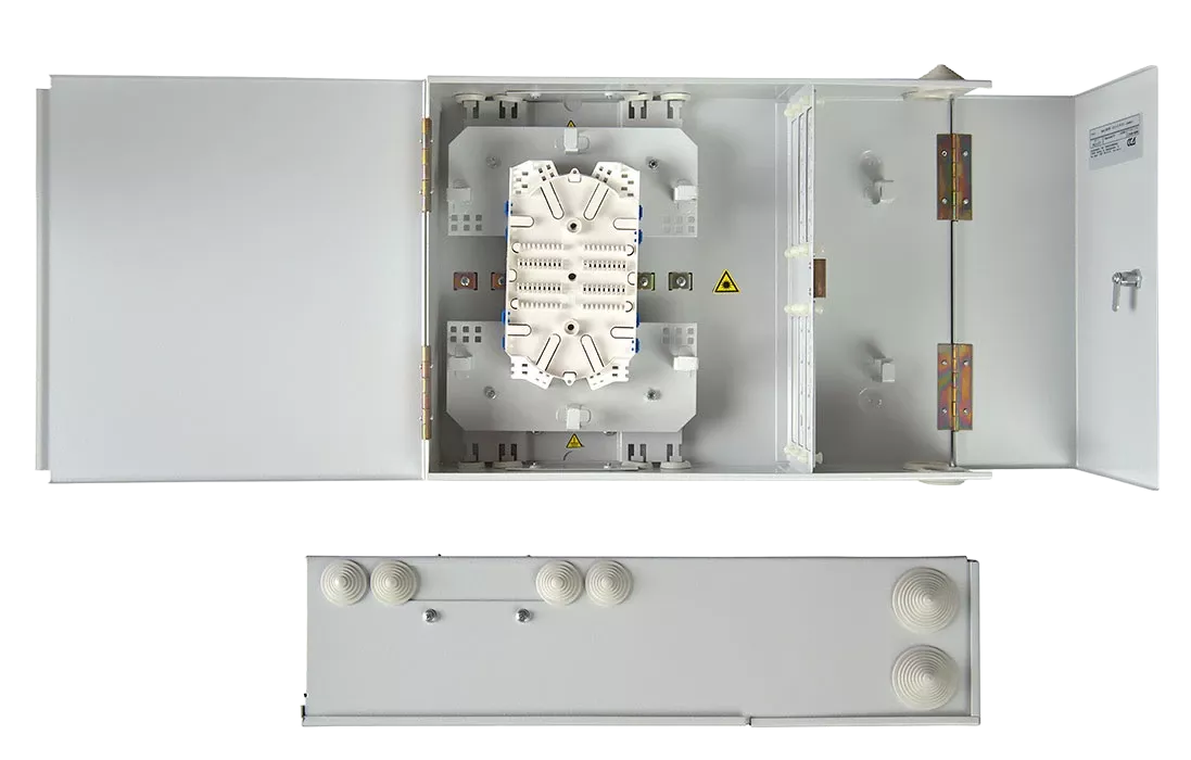 Оптические кабели разделываются и фиксируются в зоне ввода. Далее волокна в модулях поступают на кассеты для сварки с пигтейлами.