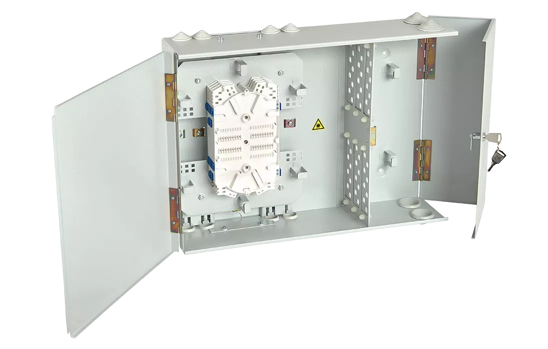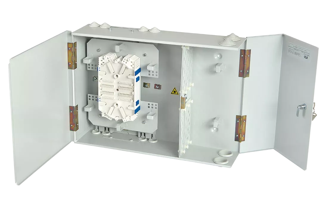 Оптические кабели разделываются и фиксируются в зоне ввода. Далее волокна в модулях поступают на кассеты для сварки с пигтейлами.