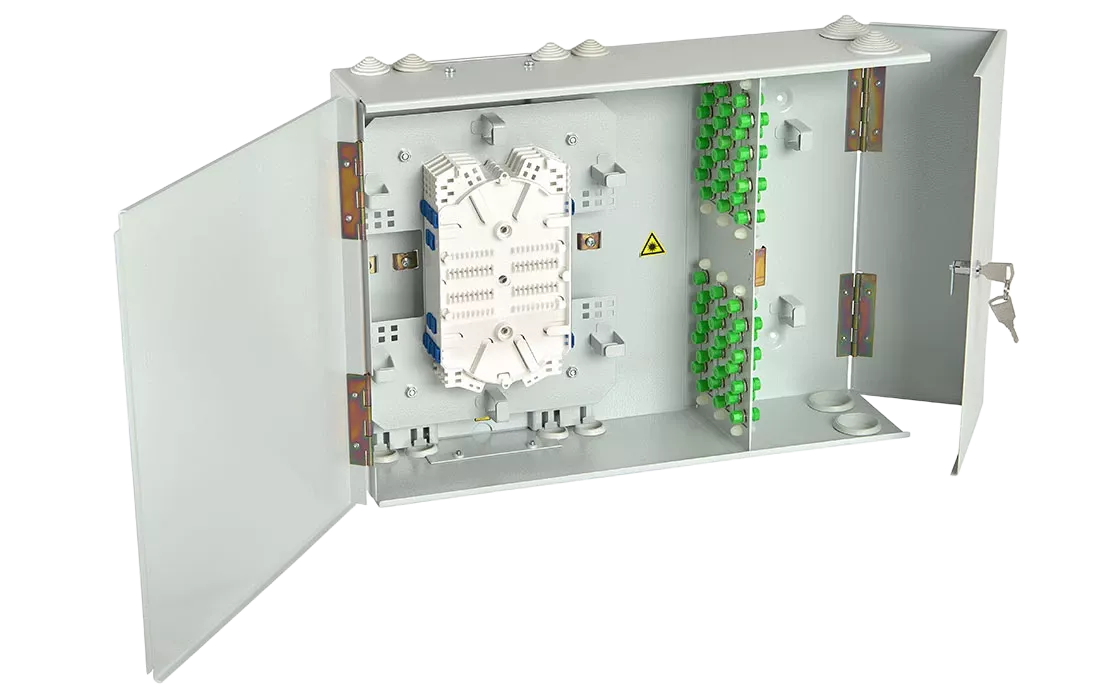 Оптические кабели разделываются и фиксируются в зоне ввода. Далее волокна в модулях поступают на кассеты для сварки с пигтейлами.