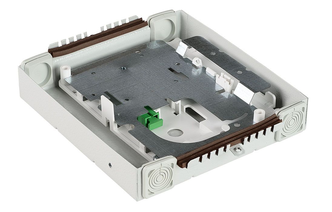 Корпус изготовлен из металла и окрашен порошковой краской. Внутри корпуса находится пластмассовая вставка, на которой выкладывается запас волокон пигтейлов, размещаются ложементы для КДЗС и оптические адаптеры для подключения входных разъемов сплиттерных модулей. Зона монтажа ОВ закрывается металлической крышкой к которой крепятся сплиттерные модули. Для ограничения доступа оснащаются винтом-секреткой.