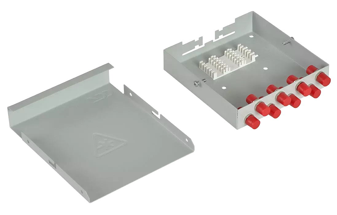 Оптические кабели разделываются и фиксируются в верхней части корпуса. Волокна свариваются с пигтейлами, КДЗС закрепляются в ложементе.