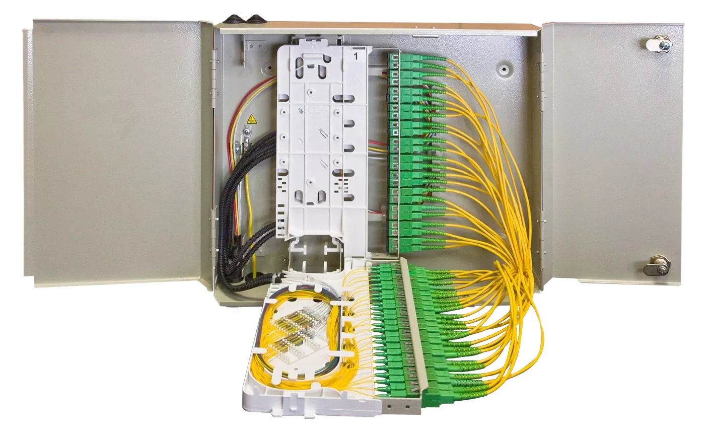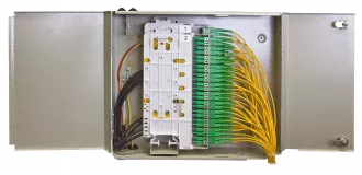 Кросс ШКОН-К-64(2)-48SC/APC содержит два кроссовых модуля общей емкостью до 48 волокон.