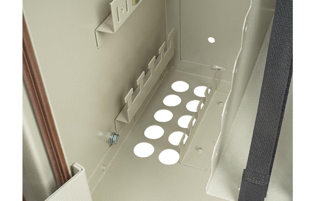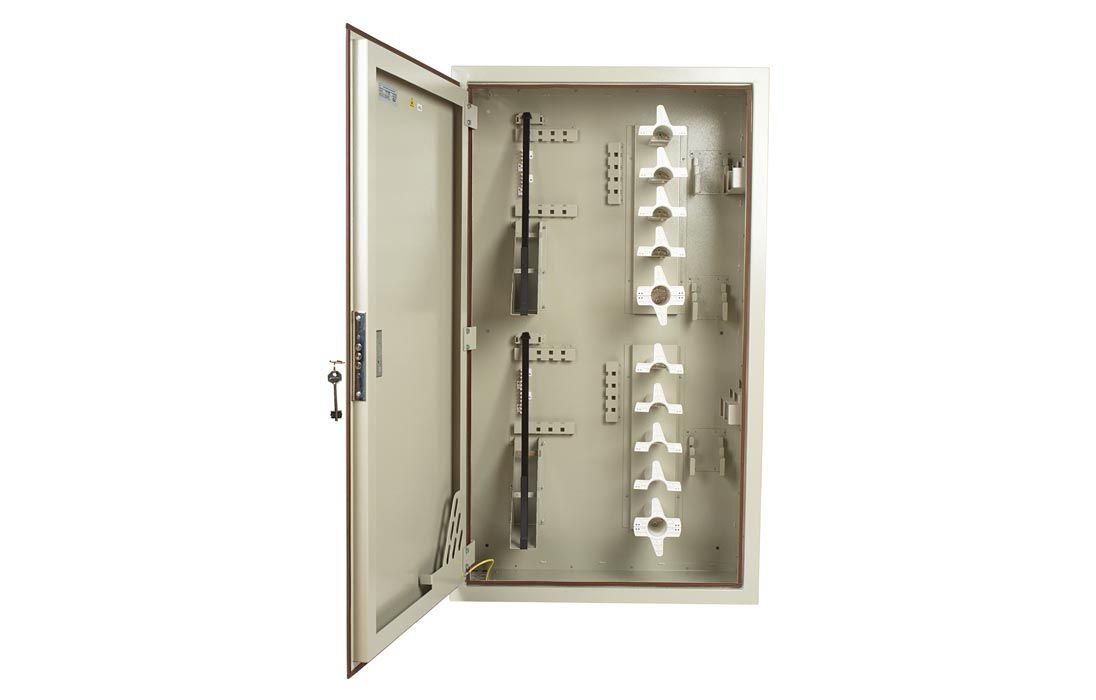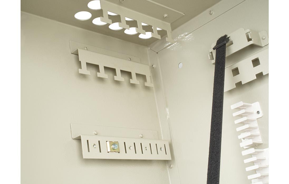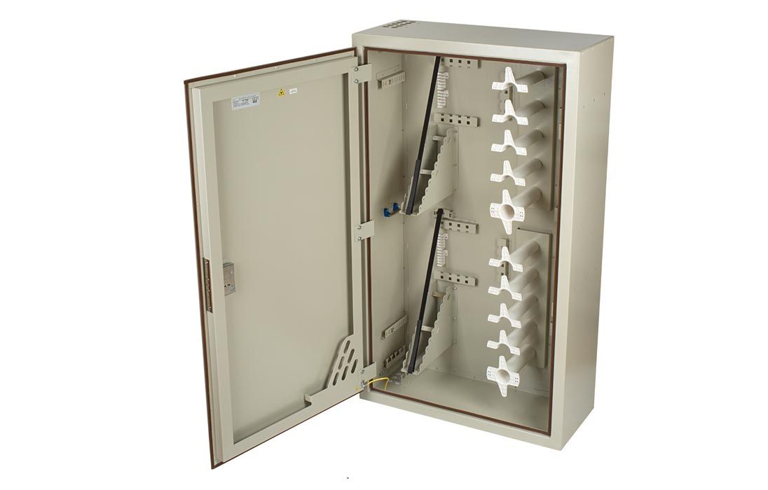 В шкафу предусмотрены несколько монтажных зон. В зоне ввода оптические кабели разделываются и фиксируются. Далее волокна в транспортных трубках поступают в зону монтажа на соответствующий кроссовый модуль. Планарные оптические разветвители устанавливаются в специальные контейнеры на правой боковой стенке шкафа.