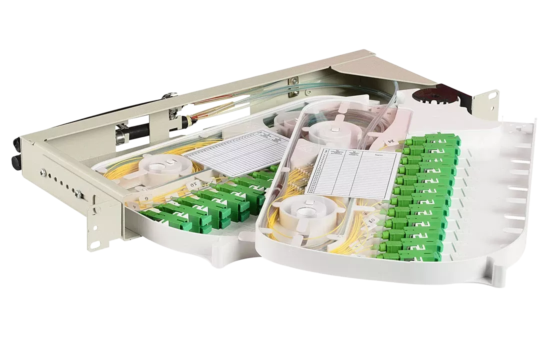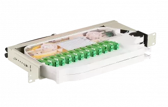 Оптические волокна в модулях поступают от ВКР в защитных транспортных трубках и закрепляются стяжками в узле ввода. Зона монтажа волокон располагается на пластиковых выдвижных полках поворотного типа.