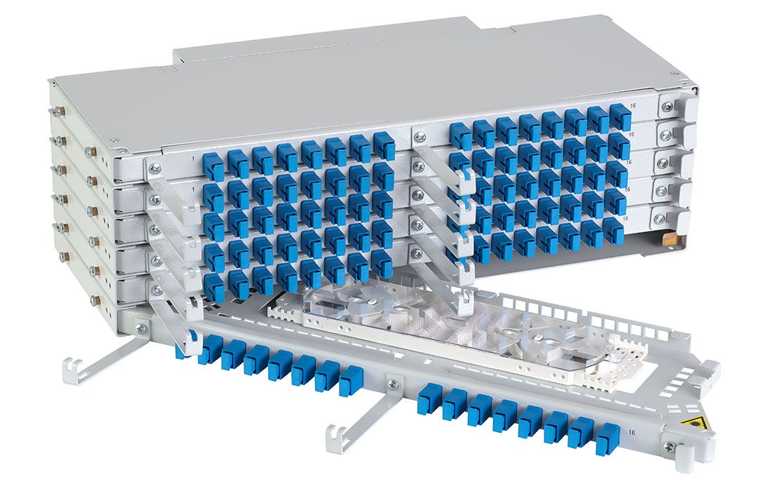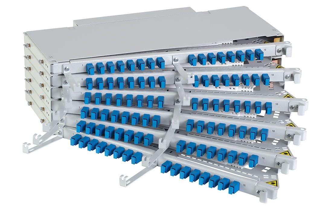 Оптические волокна в модулях поступают от ВКР в защитных транспортных трубках и закрепляются стяжками в узле ввода. Зона монтажа волокон располагается на металлических выдвижных полках поворотного типа, что облегчает монтаж и последующее обслуживание.
