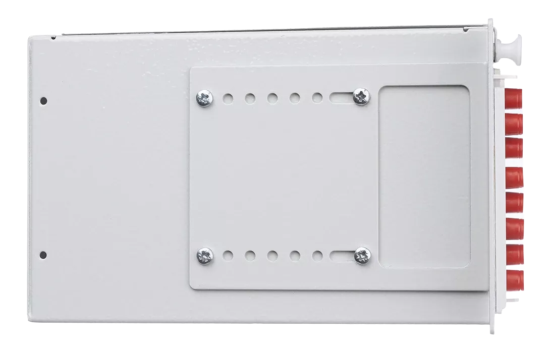Крепление кабеля по оболочке осуществляется металлическим хомутом и/или нейлоновыми стяжками, на Т-образном лепестке. Центральный силовой элемент крепится при помощи металлической скобы. Сменные пластиковые планки на 4 и 8 отверстий обеспечивают установку адаптеров-розеток различных типов: FC, SC, ST, дуплекс LC.