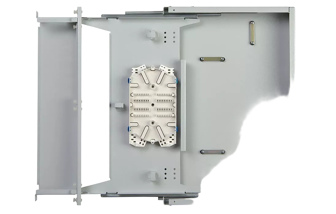 Кросс имеет выдвижную оптическую полку, что облегчает монтаж и последующее обслуживание. Для защиты патчкордов, подключаемых к розеткам кросса, корпус оснащён полкой-органайзером с защитным пластиковым экраном сверху. Подключаемые патчкорды можно вывести через специальные окна с левой и правой стороны кросса.