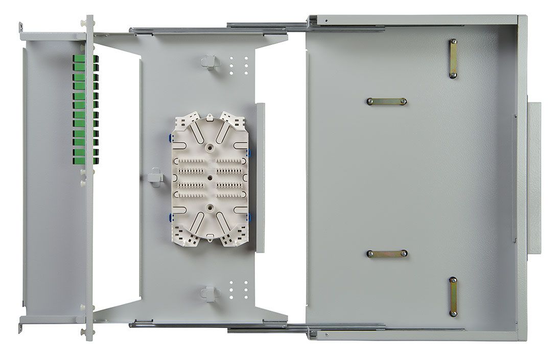 Кросс имеет выдвижную оптическую полку, что облегчает монтаж и последующее обслуживание. Для защиты патчкордов, подключаемых к розеткам кросса, корпус оснащён полкой-органайзером с защитным пластиковым экраном сверху. Подключаемые патчкорды можно вывести через специальные окна с левой и правой стороны кросса.