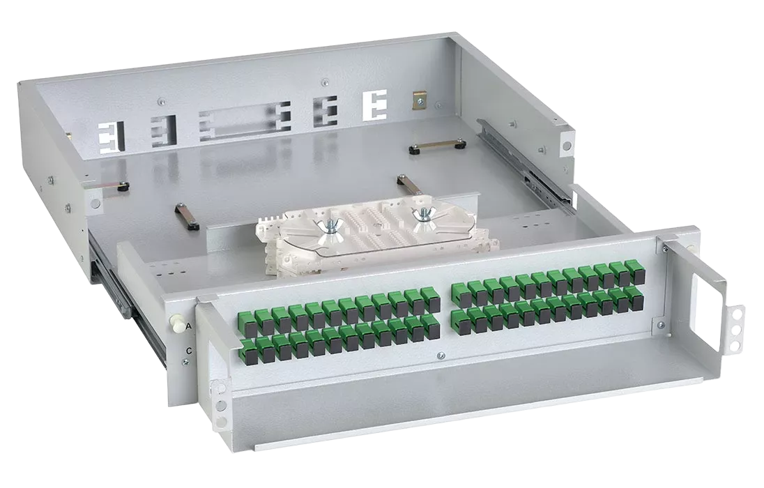 Кросс имеет выдвижную оптическую полку, что облегчает монтаж и последующее обслуживание. Для защиты патчкордов, подключаемых к розеткам кросса, корпус оснащён полкой-органайзером с защитным пластиковым экраном сверху. Подключаемые патчкорды можно вывести через специальные окна с левой и правой стороны кросса.
