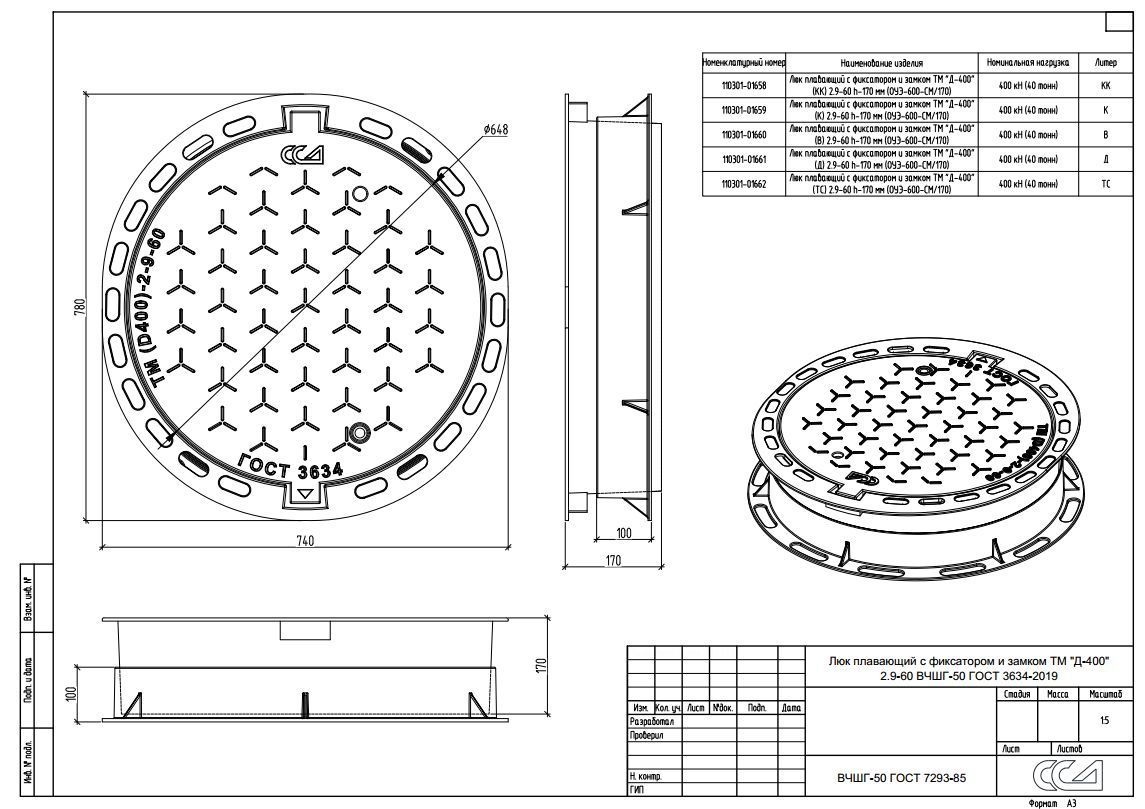 Люки отливаются из чугуна марки «ВЧ-50» согласно EN - GJS-500-7 и изготавливаются согласно ГОСТ 3634-99 — «Люки смотровых колодцев и дождеприемники ливнесточных колодцев (европейский стандарт EN 124-1994)». Дополнительная информация о люках и их маркировке приведена в описании группы.