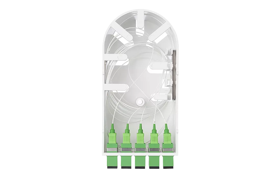 СМ6 выполнен из качественной пластмассы белого цвета и представляет из себя пластиковый корпус с местами для установки разветвителей и органайзерами для укладки волокон. На лицевой стороне модуля находятся гнёзда для установки до 20 адаптеров SC типа.