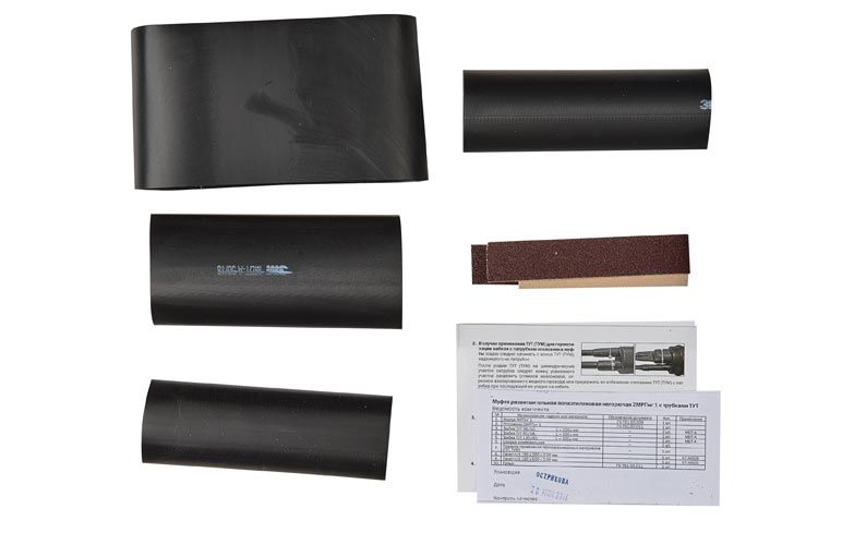 В комплект входят: корпус разветвительной полиэтиленовой муфты 2МРП 1, четыре отрезка трубок ТУТ не распространяющих горение и полоска шлифовальной шкурки. Трубки ТУТ подобраны с учётом диаметров частей муфты и диаметров оболочки кабелей типа ТП с жилами диаметром 0,5 мм.