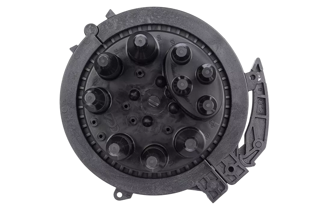Срезая патрубок в определенном месте можно подобрать отверстие максимально близкое к диаметру вводимого кабеля. Таким образом, исключается излишнее натяжение ТУТ после усадки при вводе относительно тонких кабелей. Все патрубки муфты оснащены также индивидуальными узлами крепления ЦСЭ.