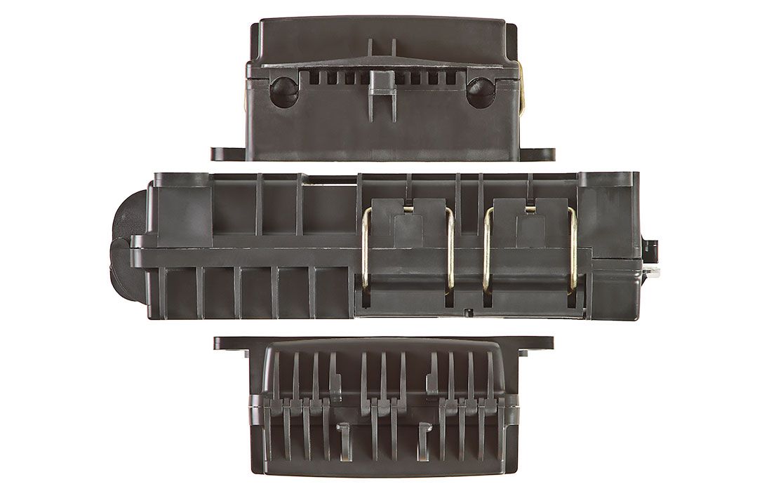 • пылезащищенный вывод до 10 дроп-кабелей круглого профиля диаметром 2-3 мм или прямоугольного профиля типа «бабочка».