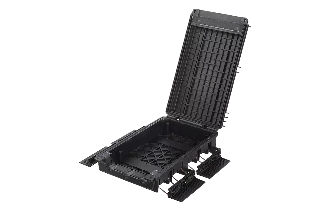 - пылезащищенный вывод до 16 дроп-кабелей круглого профиля диаметром до 5 мм или прямоугольного профиля типа «бабочка».