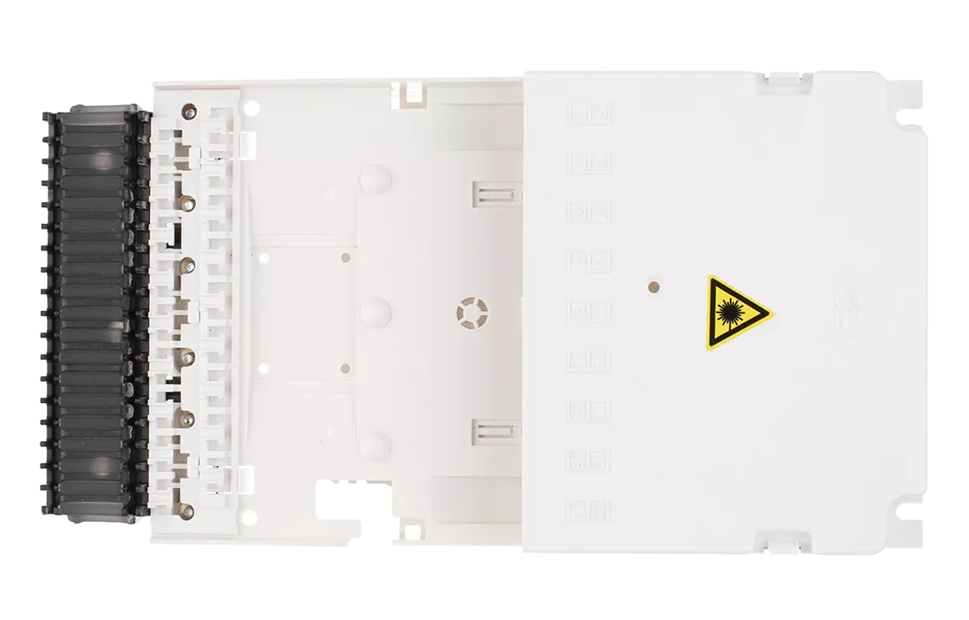 Внутри корпуса установлена съёмная монтажная панель (вставка), с тыльной стороны которой предусмотрено место для укладки транзитной петли оптических модулей, установлены фиксаторы ЦСЭ и кассеты для сварки волокон распределительных ВОК, а также ложементы, на который можно установить разветвители в мини-корпусах с волокнами в буферном покрытии 900 мкм. Предусмотрена установка двух разветвителей в мини-корпусах 1х8 -PLC -SM/0,9 -1,0 м-SC/APC или четырёх разветвителей 1х4 -PLC -SM/0,9 -1,0 м-SC/APC или одного разветвителя 1х16 -PLC -SM/0,9 -1,0 м-SC/APC. На лицевой стороне панели расположена планка для адаптеров SC типа и ложементы Л12-4525 для размещения сварных стыков абонентских дроп-кабелей с пигтейлами. Место размещения сварных соединений дроп-кабелей защищено специальной пластиковой крышкой.