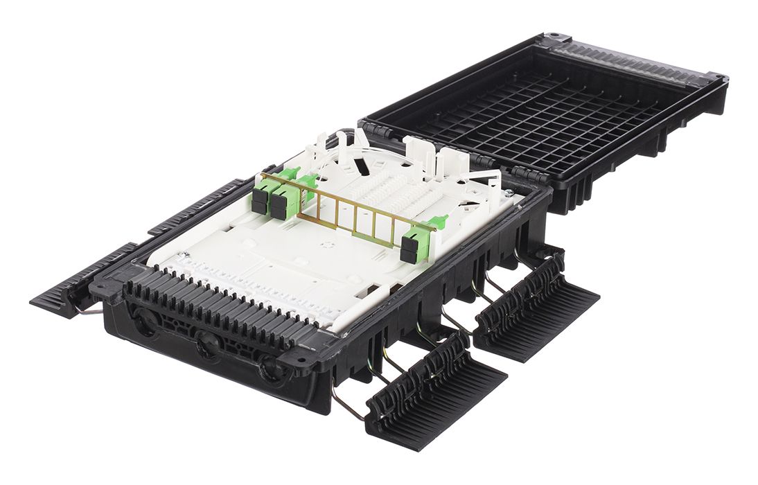 Выполнена из пластмассы и имеет пыле-брызгозащищенную тупиковую конструкцию (ввод ОК и вывод абонентских дроп-кабелей производится с одной стороны).