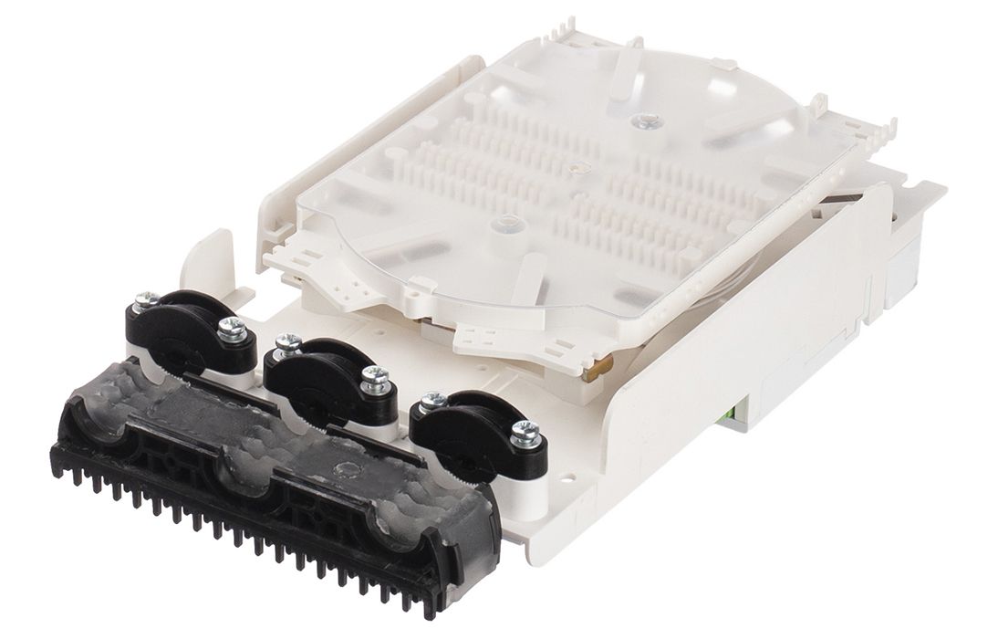- пылезащищенный вывод до 16 дроп-кабелей круглого профиля диаметром до 5 мм или прямоугольного профиля типа «бабочка».