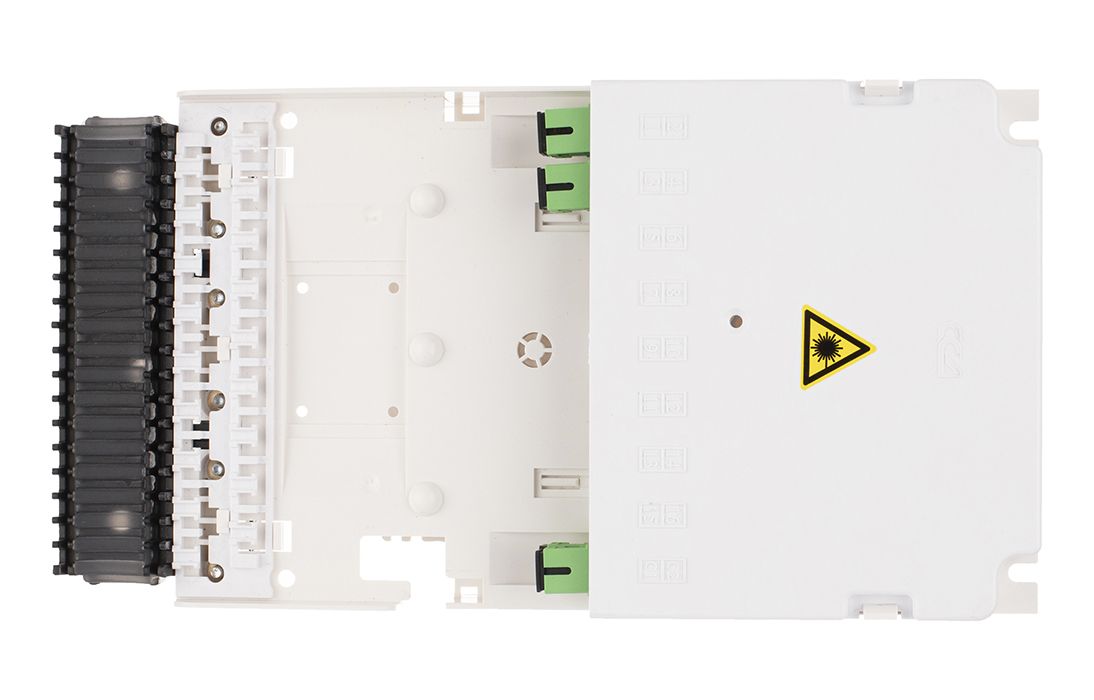 Внутри корпуса установлена съёмная монтажная панель (вставка), с тыльной стороны которой предусмотрено место для укладки транзитной петли оптических модулей, установлены фиксаторы ЦСЭ и кассеты для сварки волокон распределительных ВОК, а также ложементы, на который можно установить разветвители в мини-корпусах с волокнами в буферном покрытии 900 мкм. Предусмотрена установка двух разветвителей в мини-корпусах 1х8 -PLC -SM/0,9 -1,0 м-SC/APC или четырёх разветвителей 1х4 -PLC -SM/0,9 -1,0 м-SC/APC или одного разветвителя 1х16 -PLC -SM/0,9 -1,0 м-SC/APC. На лицевой стороне панели расположена планка для адаптеров SC типа и ложементы Л12-4525 для размещения сварных стыков абонентских дроп-кабелей с пигтейлами. Место размещения сварных соединений дроп-кабелей защищено специальной пластиковой крышкой.