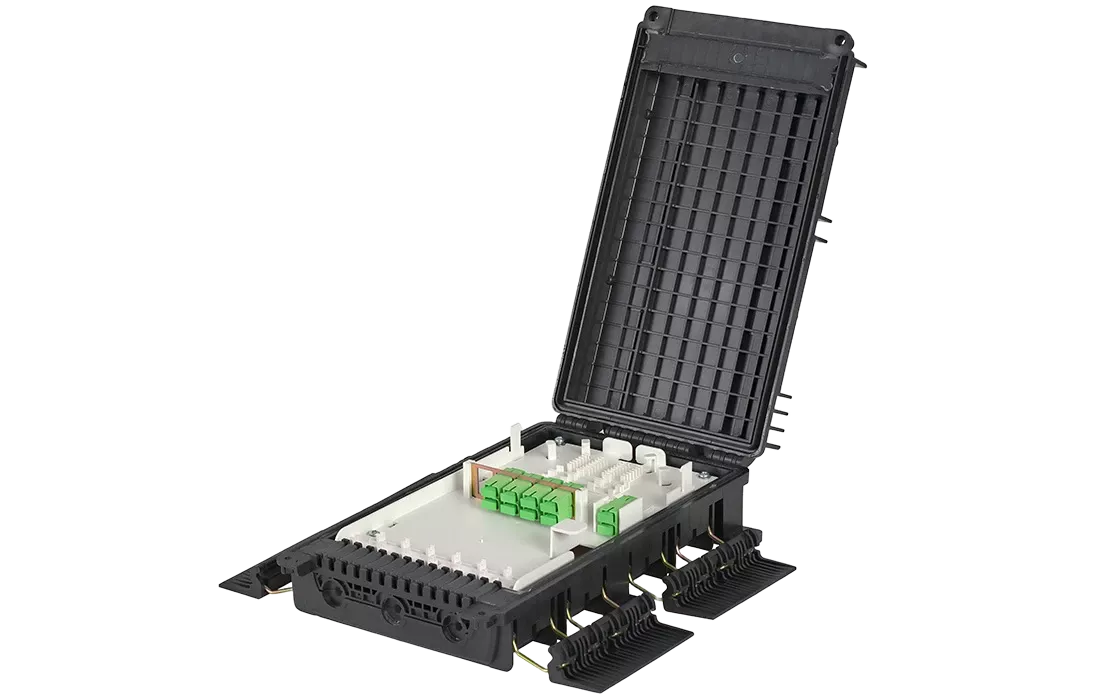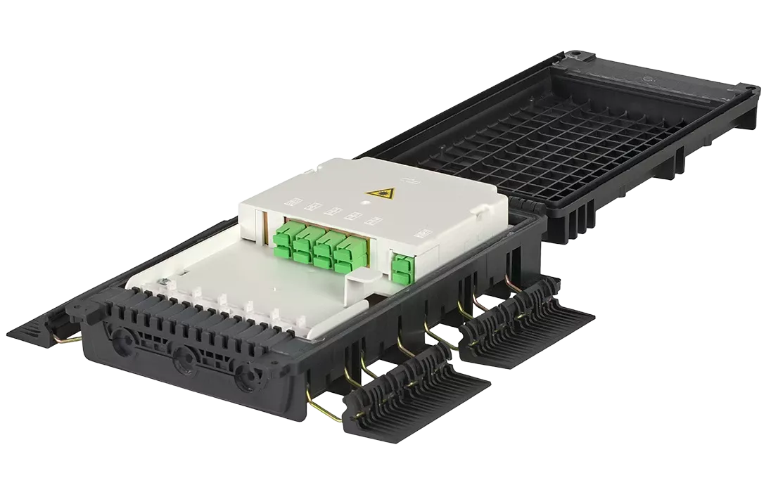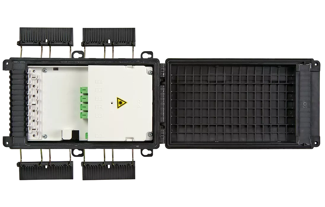 Выполнена из пластмассы и имеет пыле-брызгозащищенную тупиковую конструкцию (ввод ОК и вывод абонентских дроп-кабелей производится с одной стороны).