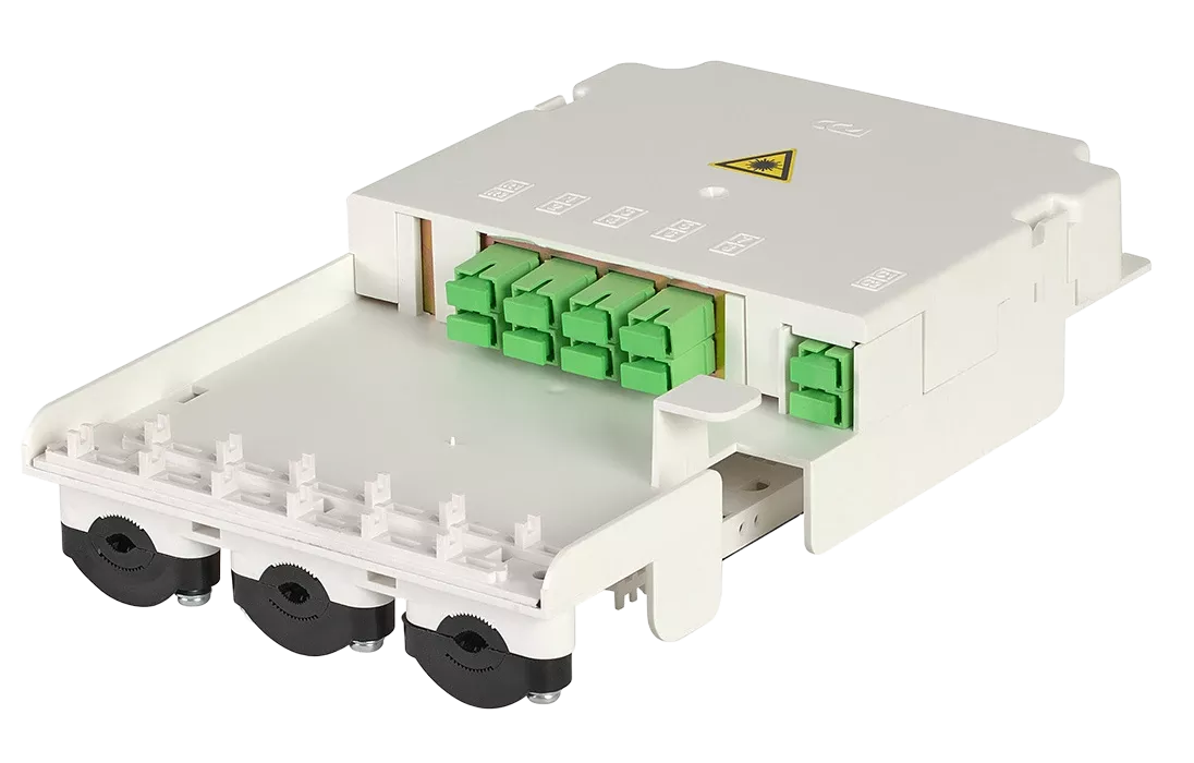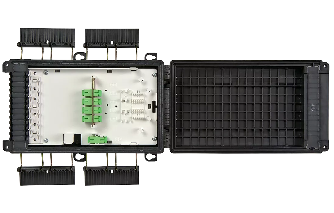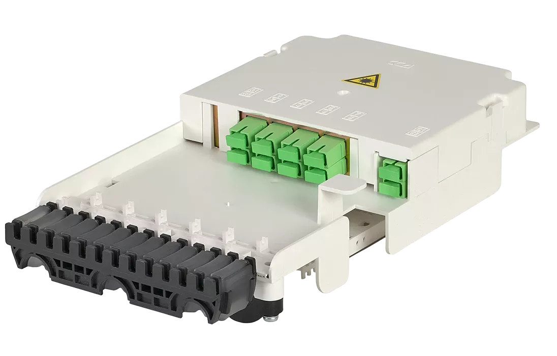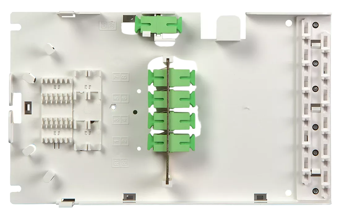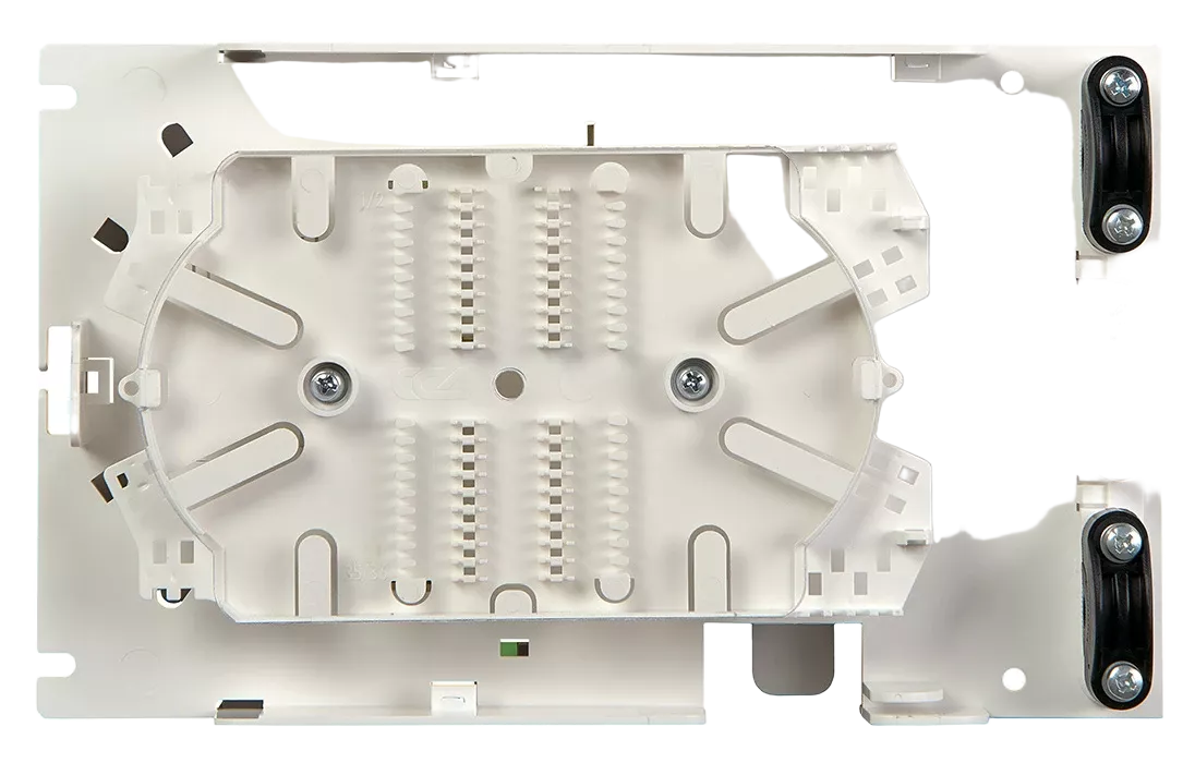 Внутри корпуса установлена съёмная монтажная панель (вставка), с тыльной стороны которой предусмотрено место для укладки транзитной петли оптических модулей, установлены фиксаторы ЦСЭ и кассета КТ-3645 для сварки волокон распределительных ВОК. На лицевой стороне панели находятся гнёзда для установки адаптеров типа SC, а также ложемент Л2-СП, на который можно установить разветвители в мини-корпусах с волокнами длиной 1 метр в буферном покрытии 900 мкм и ложемент Л12-4525 для размещения сварных стыков абонентских дроп-кабелей с пигтейлами. Предусмотрена установка одного разветвителя РО-1х8 -PLC -SM/0,9 -1,0 м-SC/APC или двух разветвителей РО-1х4 -PLC -SM/0,9 -1,0 м-SC/APC, оконцованных разъемами SC. Место размещения сплиттеров и сварных соединений дроп-кабелей защищено специальной пластиковой крышкой.