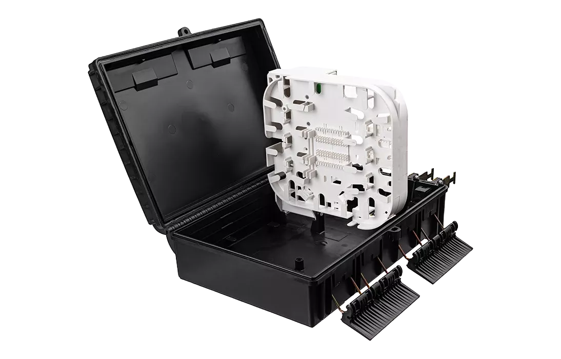 Выполнена из устойчивого к атмосферным воздействиям, УФ стойкого пластика и имеет пыле-влагозащищенную тупиковую конструкцию (ввод ОК и вывод абонентских дроп-кабелей производится с одной стороны).