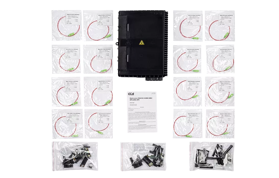 Внутри муфты установлена оригинальная кассета, на внешней стороне которой размещена кроссовая панель или съемный модуль СМ5, в которой можно разместить до 20 адаптеров типа SC, из них 16 предназначены для подключения абонентов и 4 для подключения разветвителей в мини корпусе (4 шт. 1х4 или 2 шт. 1х8, или 1 шт. 1х16). Выводы разветвителей и пигтейлы защищаются от повреждений корпусом модуля СМ5. Перед кроссовой панелью установлен ложемент для сварки пигтейлов и неоконцованных абонентских дроп- кабелей. На обратной стороне кассеты могут быть размещены ложементы для установки разветвителей и ложементы для 48 гильз ССД КДЗС 4525, а также поле для размещения запаса ОВ и выводов разветвителей.