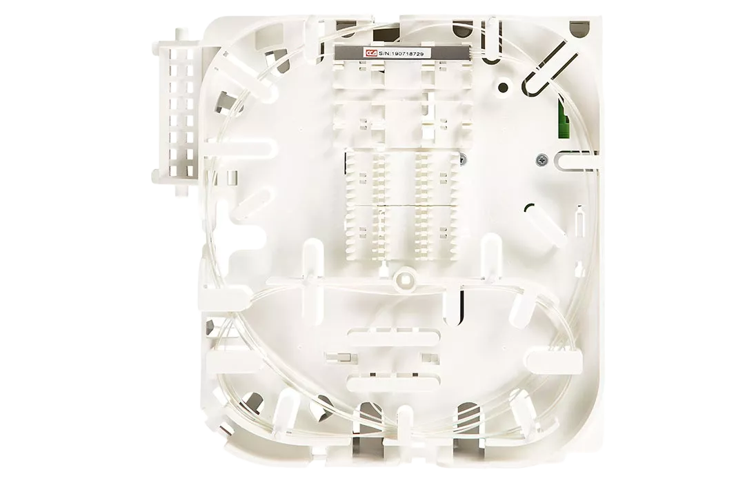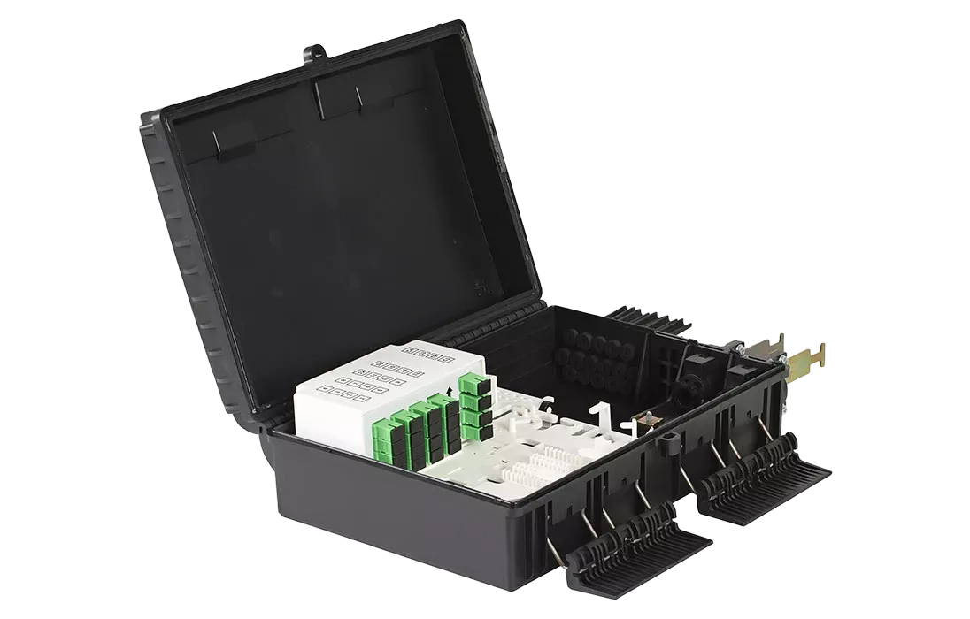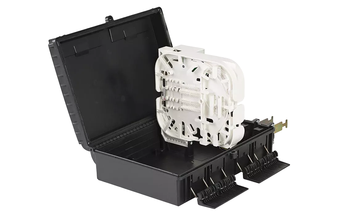 Выполнена из пластмассы и имеет пыле-брызгозащищенную тупиковую конструкцию (ввод ОК и вывод ШОС производится с одной стороны).