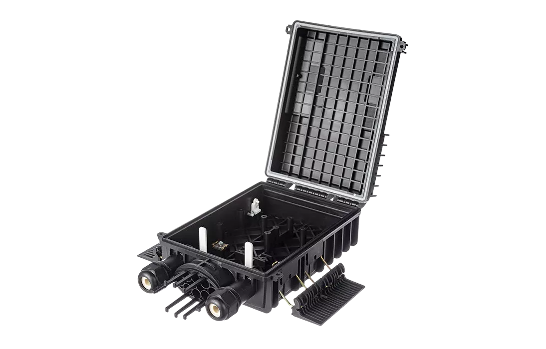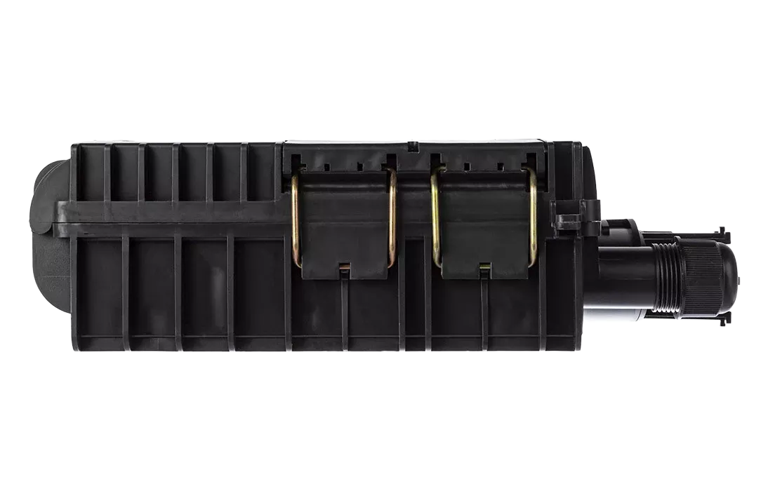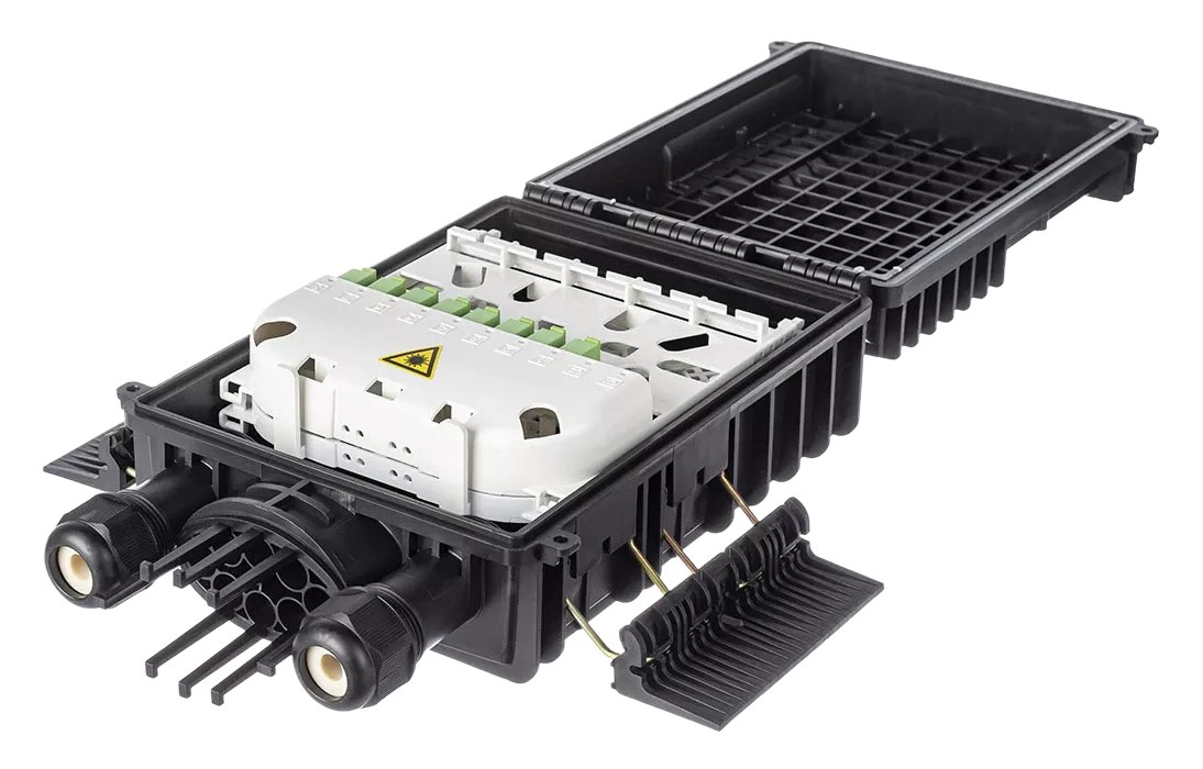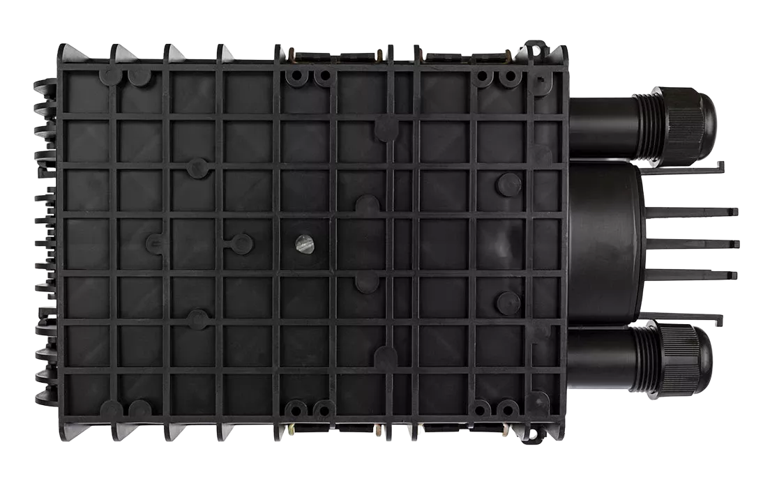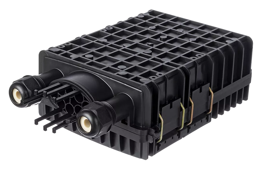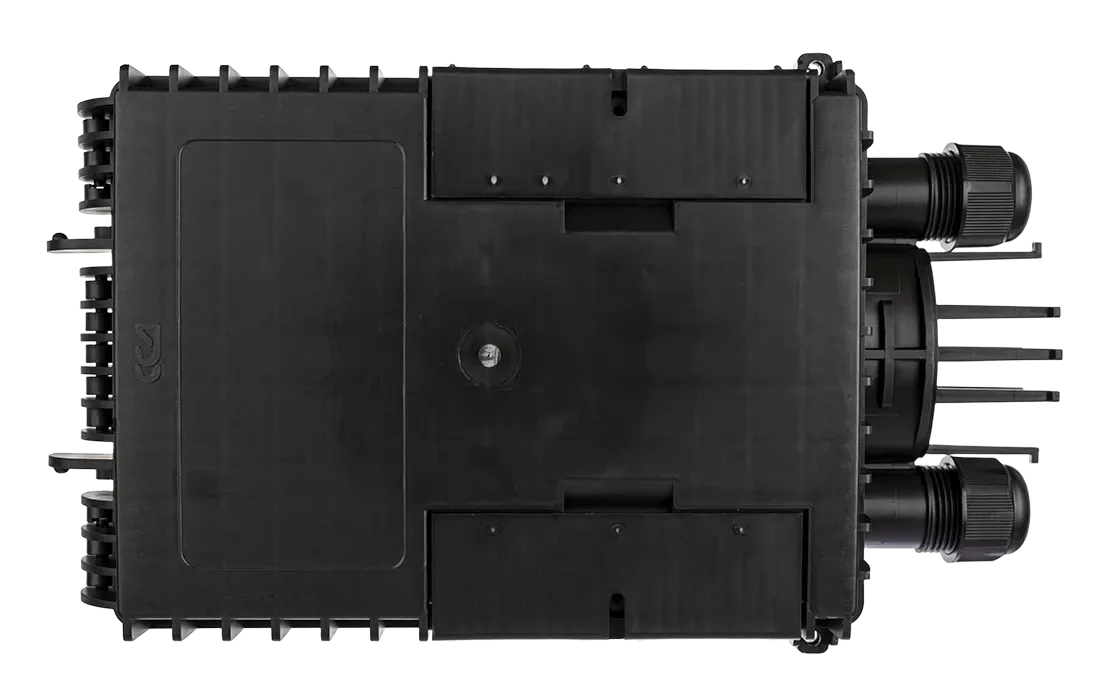 Выполнена из пластмассы и имеет пыле-брызгозащищенную конструкцию (ввод ОК и вывод абонентских дроп-кабелей производится с одной стороны).