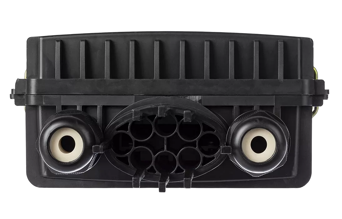 - пылезащищенный вывод до 8 дроп-кабелей круглого профиля диаметром до 5 мм или прямоугольного профиля типа «бабочка».