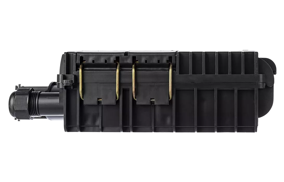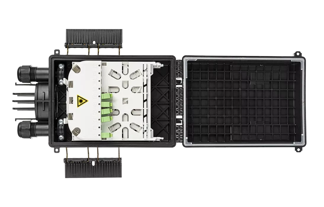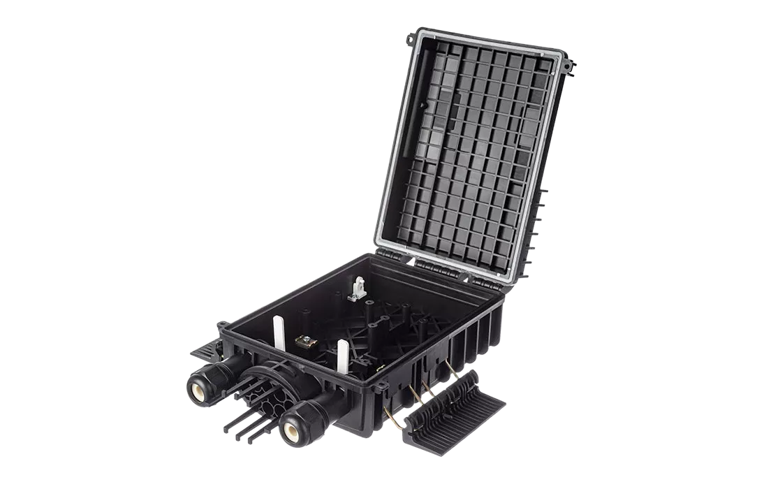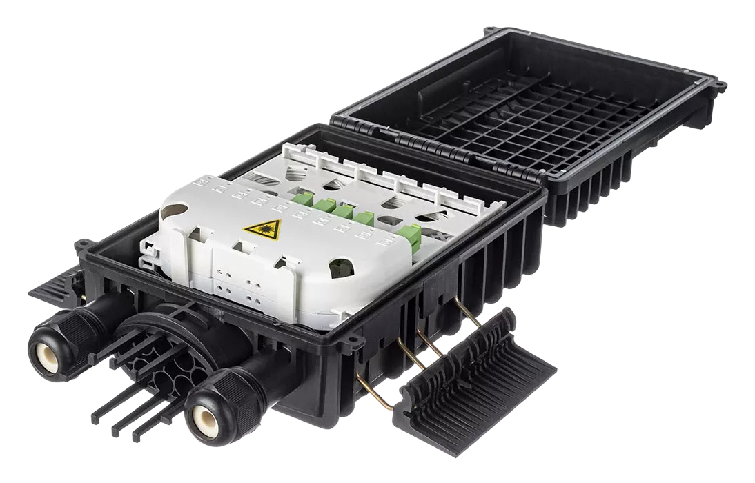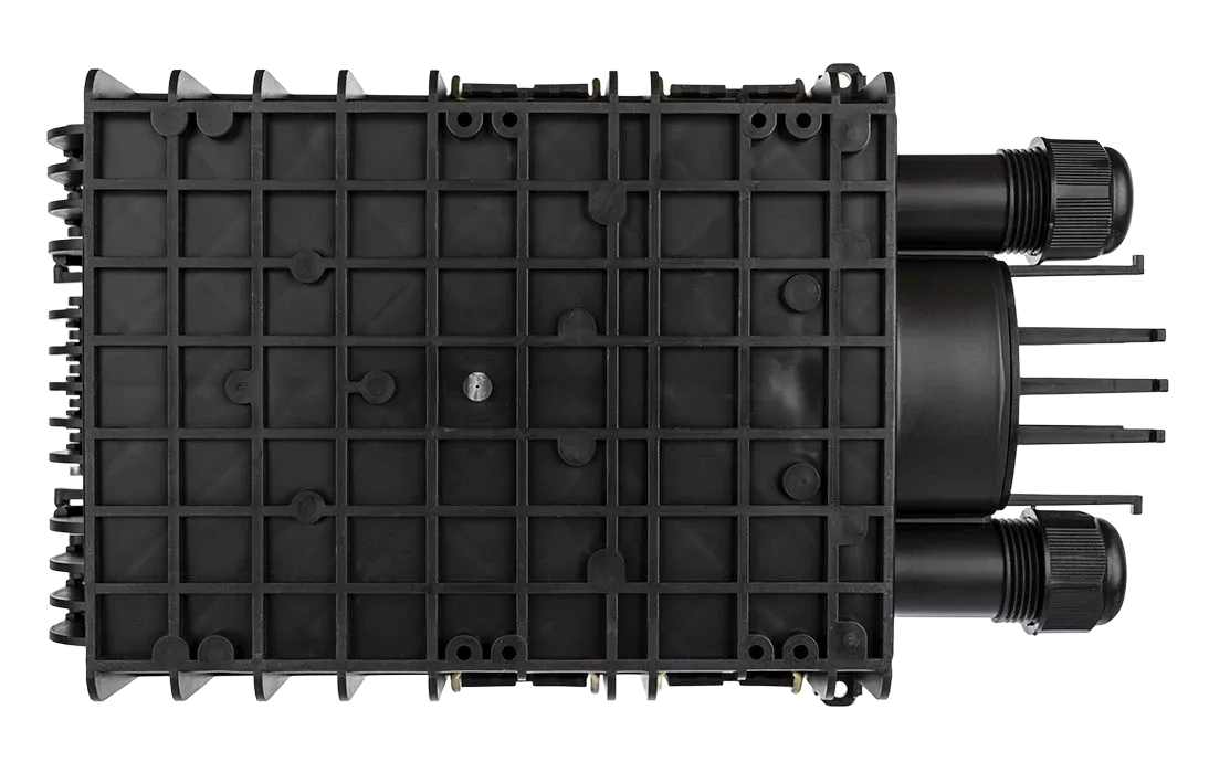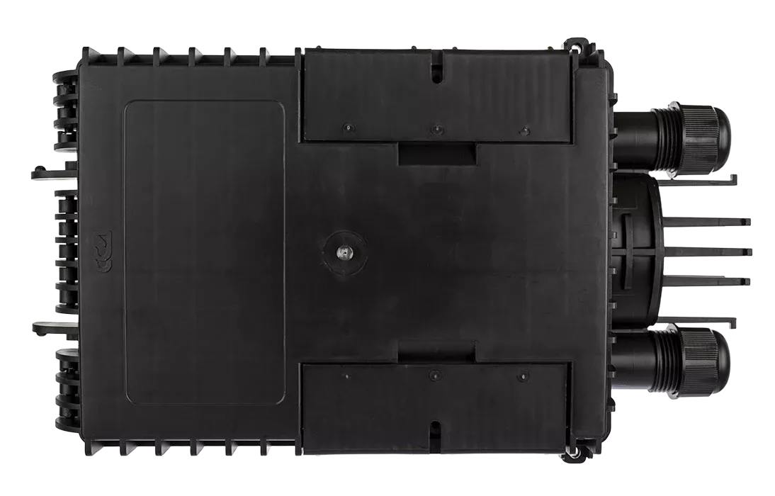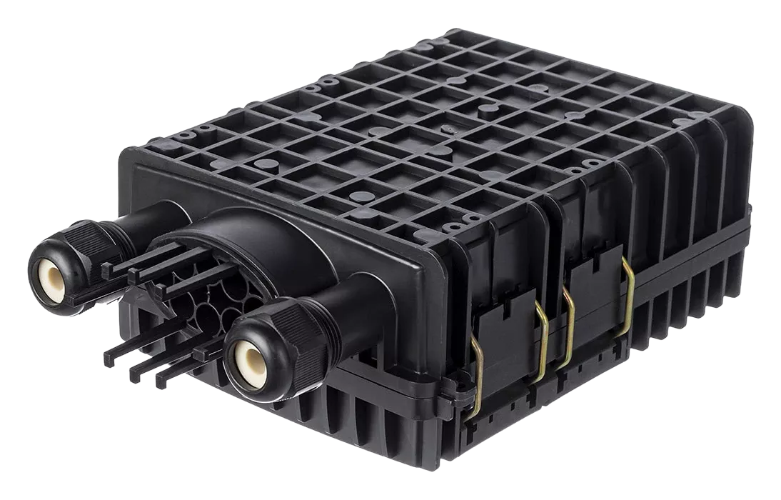 Выполнена из пластмассы и имеет пыле-брызгозащищенную конструкцию (ввод ОК и вывод абонентских дроп-кабелей производится с одной стороны).