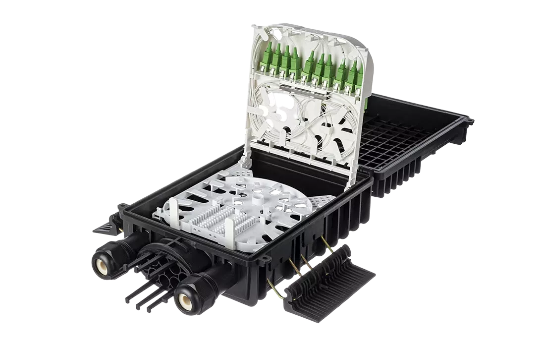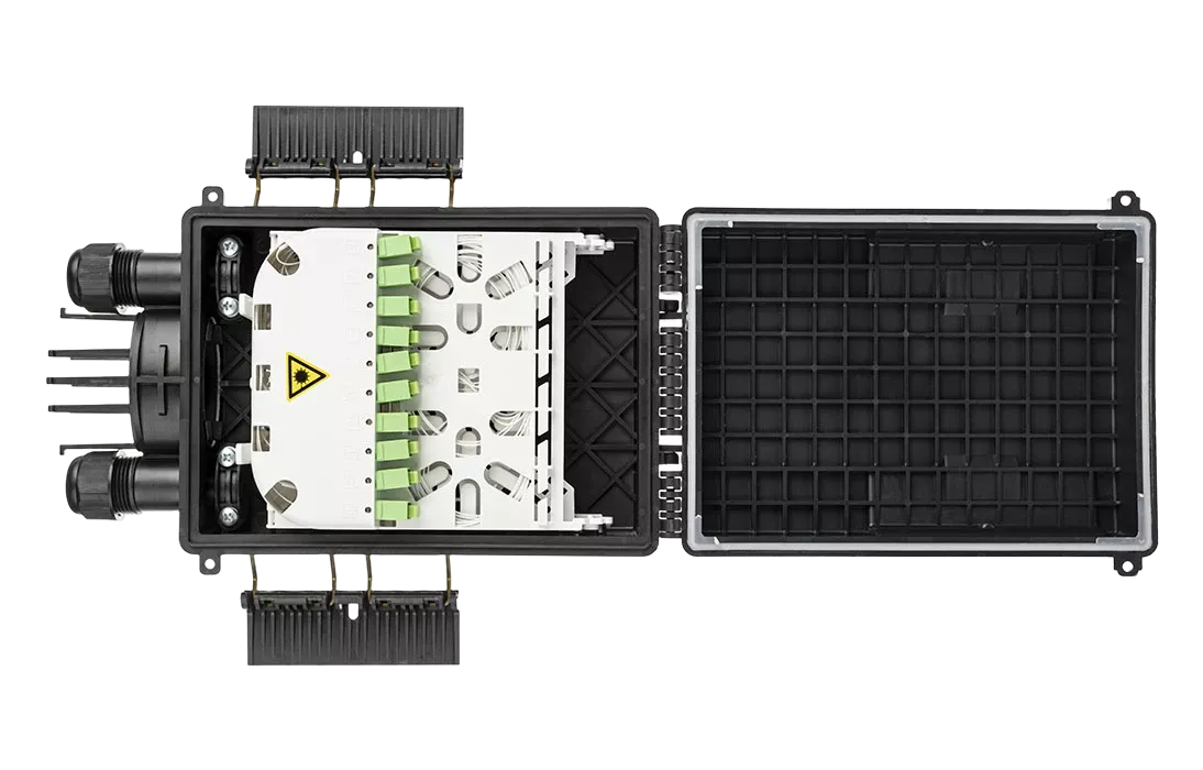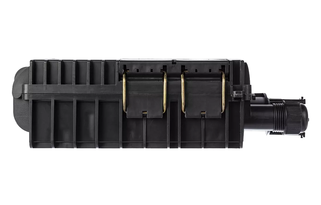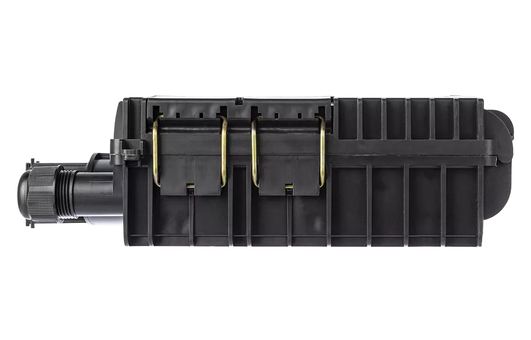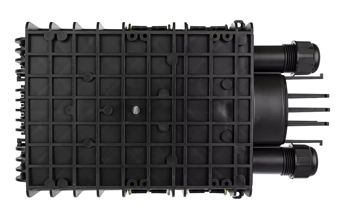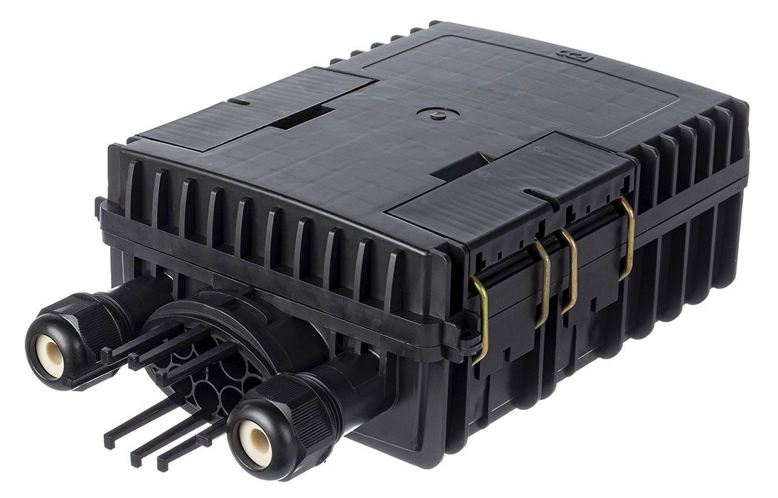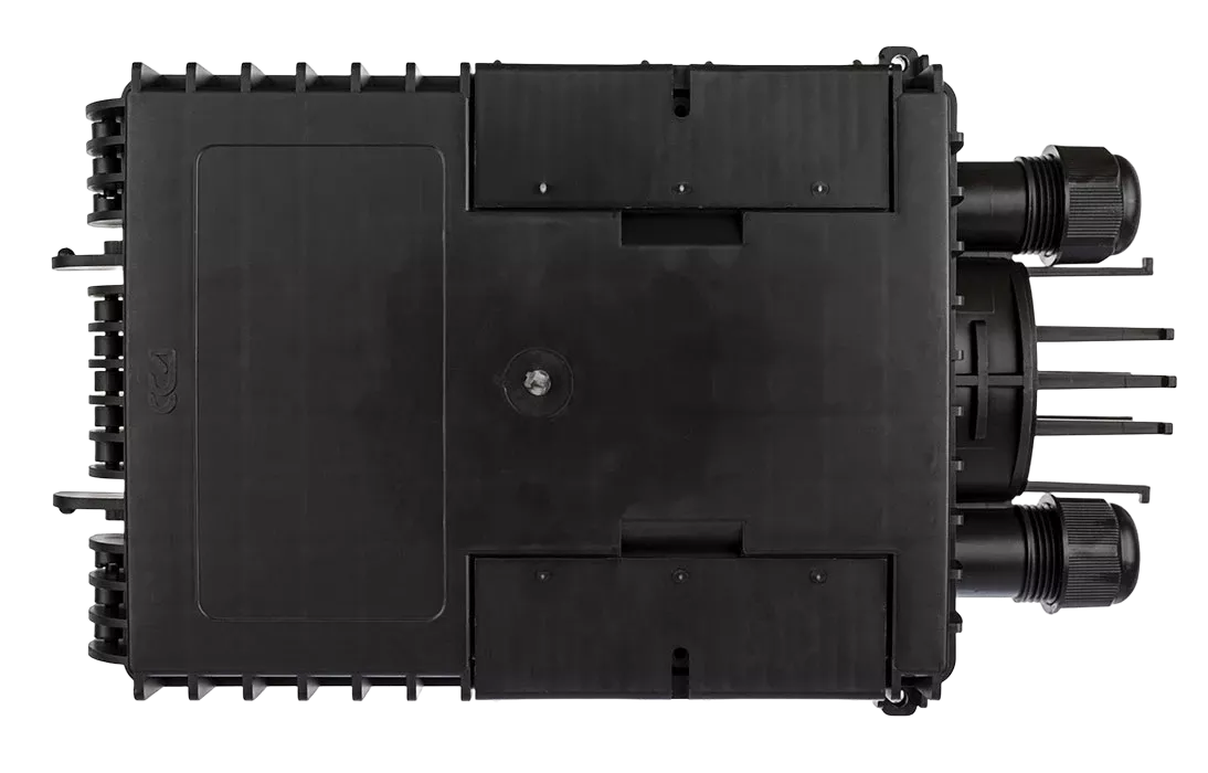 Выполнена из пластмассы и имеет пыле-брызгозащищенную конструкцию (ввод ОК и вывод абонентских дроп-кабелей производится с одной стороны).