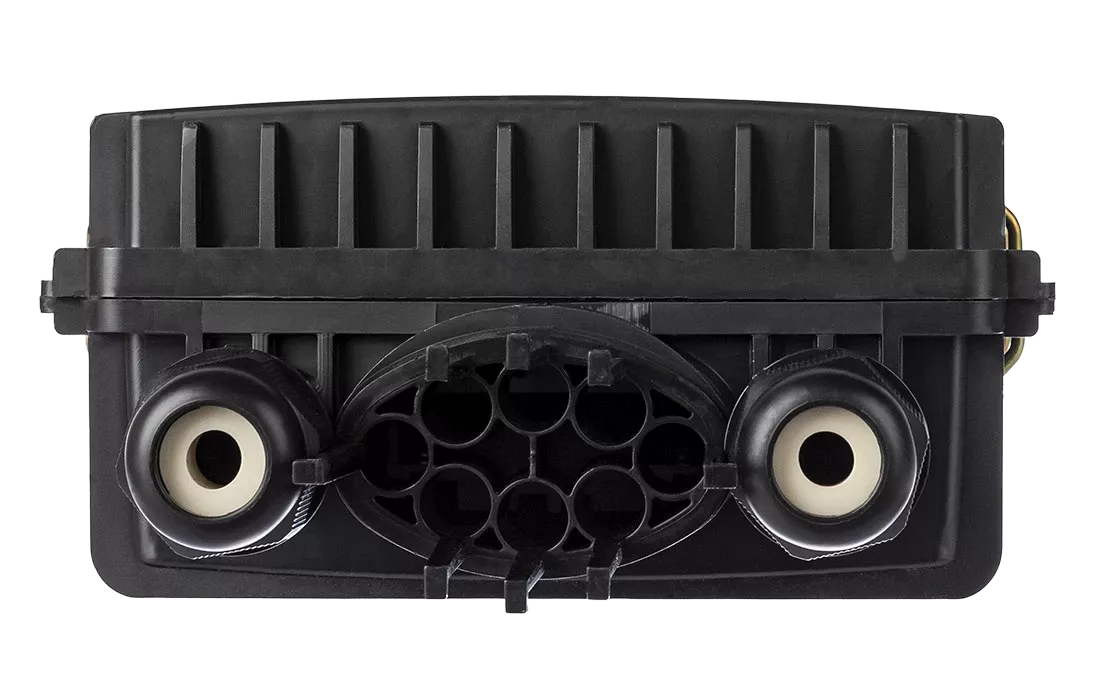 - пылезащищенный вывод до 8 дроп-кабелей круглого профиля диаметром до 5 мм или прямоугольного профиля типа «бабочка».