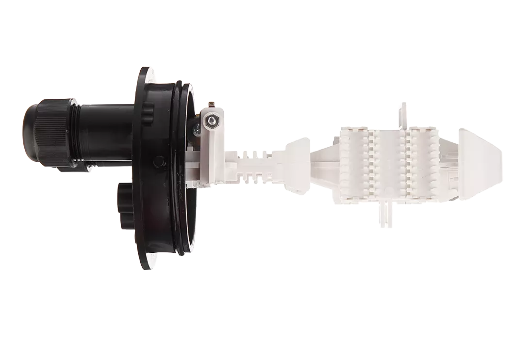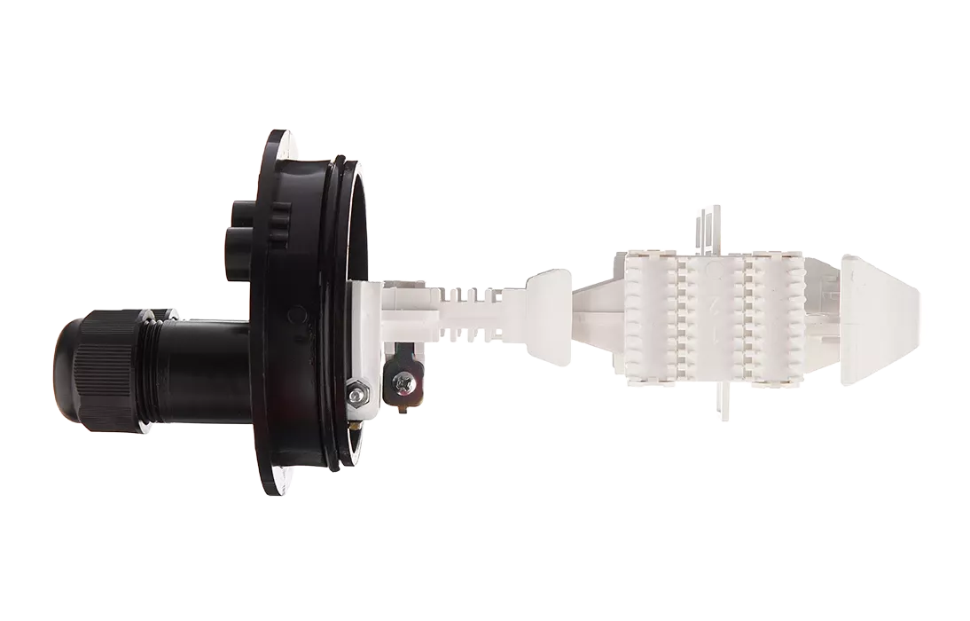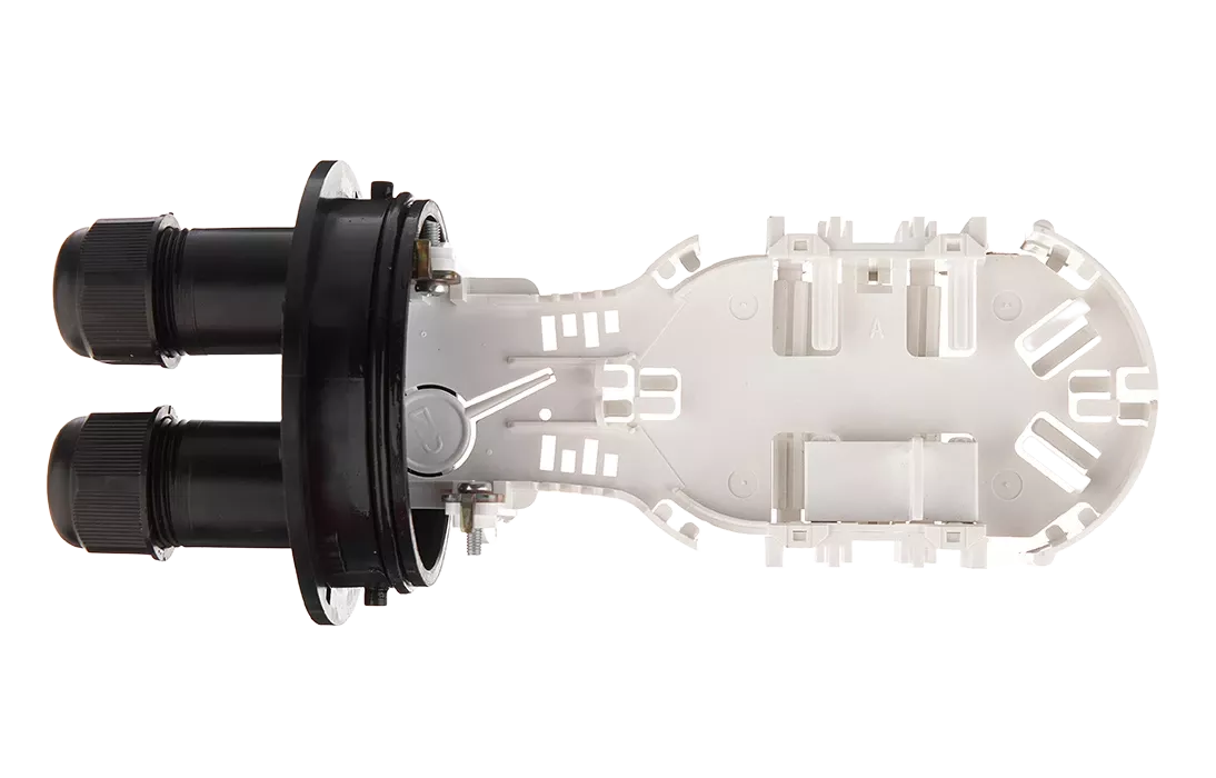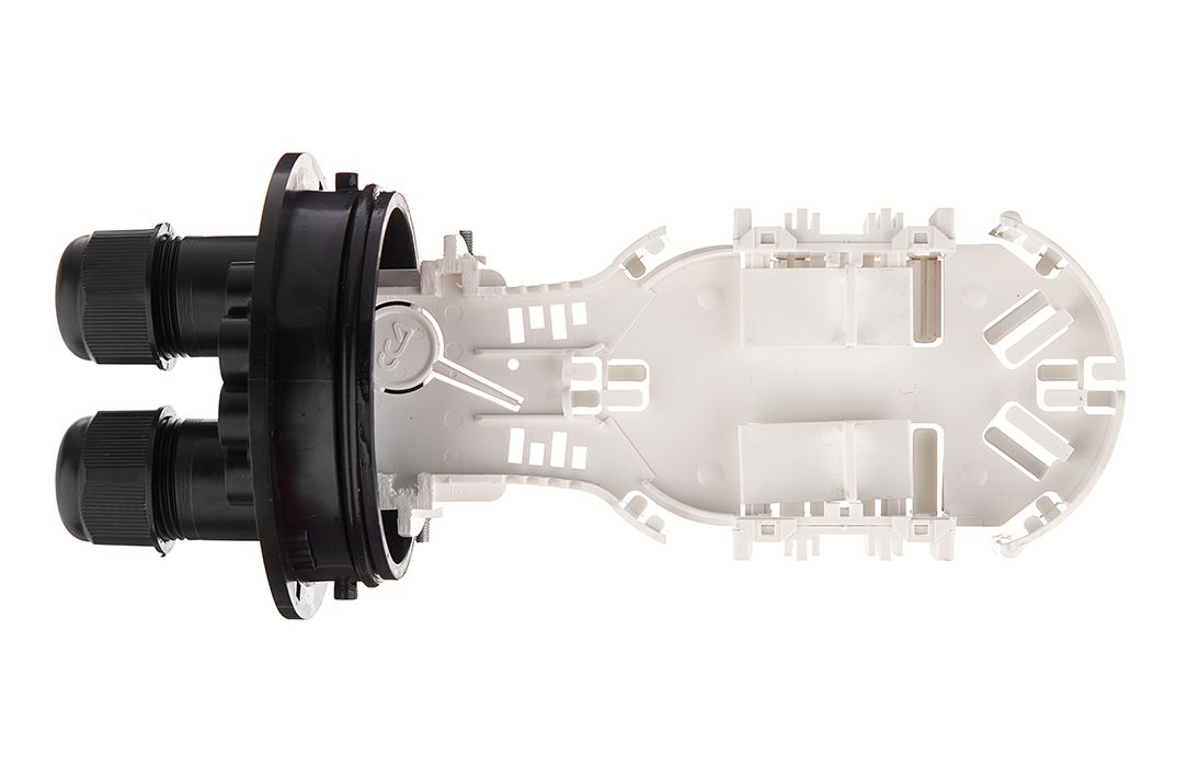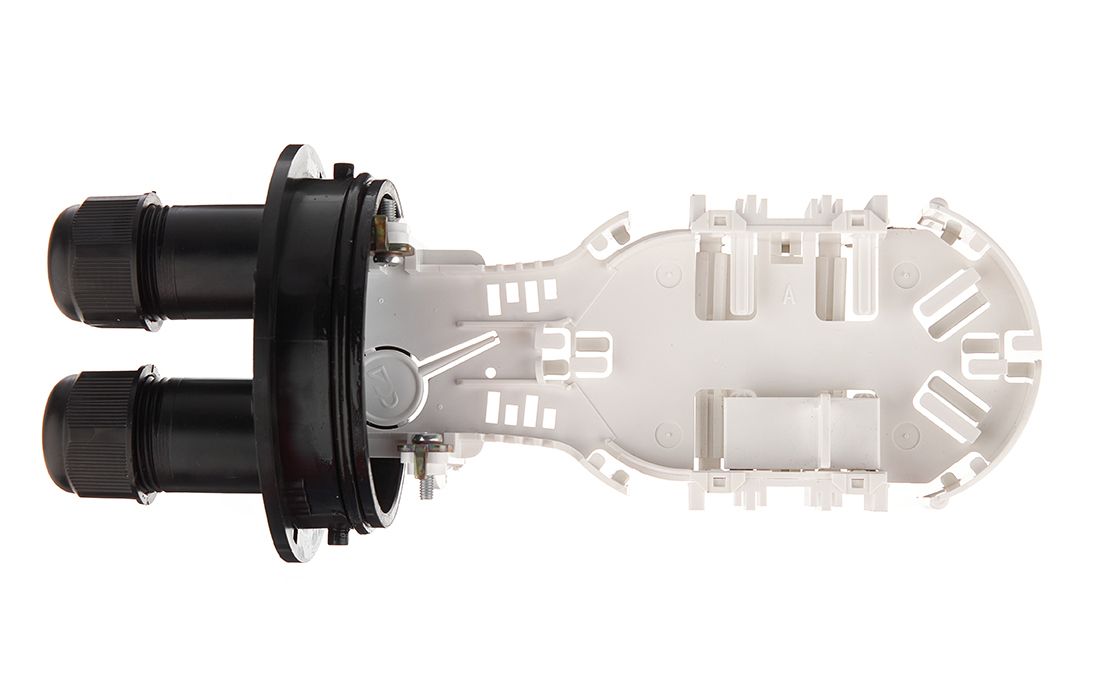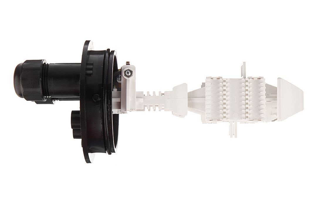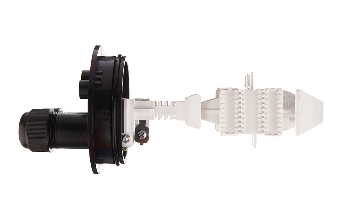 Ввод абонентских дроп-кабелей осуществляется с помощью проходных отверстий на оголовнике, диаметр которых позволяет вводить в муфту дроп-кабели с разъемами SC типа. Герметизация вводов достигается с помощью разрезных эластичных втулок (заглушек).