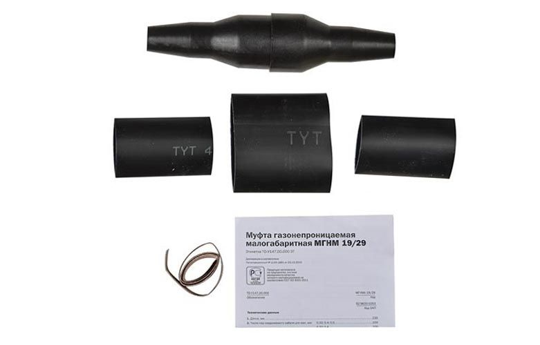 Муфты представляют собой комплекты состоящие из деталей корпуса и термоусаживаемых трубок используемых для герметизации муфты. Муфты в процессе монтажа заливаются саморасширяющимся полиуретановым герметиком «Вилад-31», состоящим из двух компонентов, А и Б (приобретается отдельно).